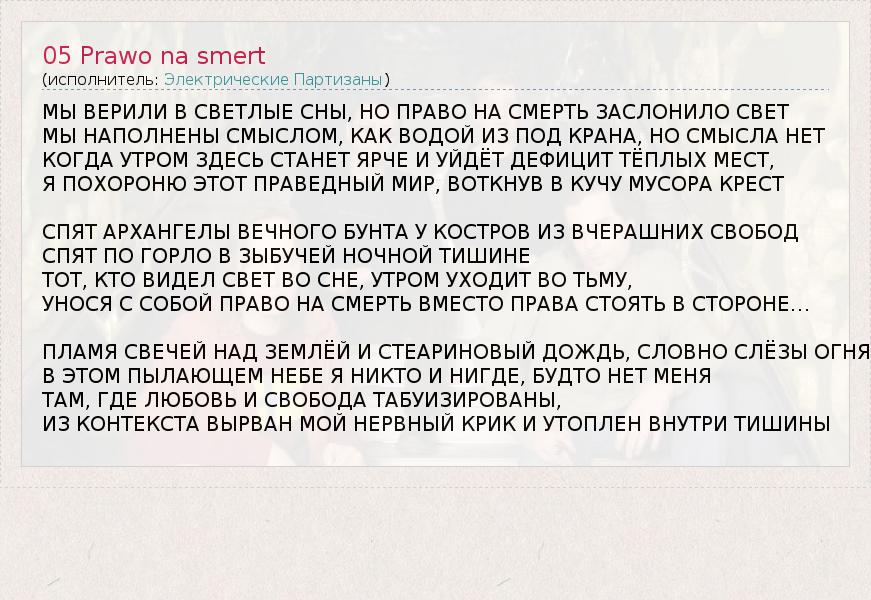 А как ты думаешь, о чем песня "05 Prawo na smert" ?