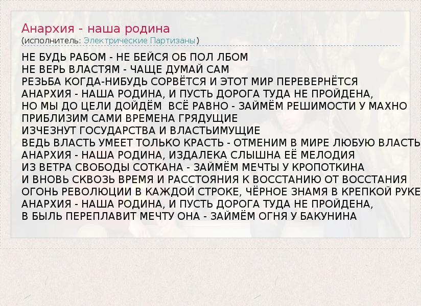 АНАРХИЯ - НАША РОДИНА, ИЗДАЛЕКА СЛЫШНА ЕЁ МЕЛОДИЯ