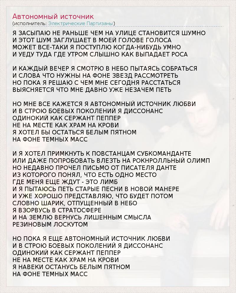 Я ЗАСЫПАЮ НЕ РАНЬШЕ ЧЕМ НА УЛИЦЕ СТАНОВИТСЯ ШУМНО И ЭТОТ ШУМ ЗАГЛУШАЕТ В МОЕЙ ГОЛОВЕ ГОЛОСА МОЖЕТ ВСЕ-ТАКИ Я ПОСТУПЛЮ КОГДА-НИБУДЬ УМНО И УЕДУ ТУДА ГДЕ УТРОМ СЛЫШНО КАК ВЫПАДАЕТ РОСА И КАЖДЫЙ ВЕЧЕР Я СМОТРЮ В НЕБО ПЫТАЯСЬ СОБРАТЬСЯ И СЛОВА ЧТО НУЖНЫ НА ФОНЕ ЗВЕЗД РАССМОТРЕТЬ НО ПОКА Я РЕШАЮ С ЧЕМ МНЕ СЕГОДНЯ РАССТАТЬСЯ ВЫЯСНЯЕТСЯ ЧТО МНЕ ДАВНО УЖЕ НЕЗАЧЕМ ПЕТЬ НО МНЕ ВСЕ КАЖЕТСЯ Я АВТОНОМНЫЙ ИСТОЧНИК ЛЮБВИ И В СТРОЮ БОЕВЫХ ПОКОЛЕНИЙ Я ДИССОНАНС ОДИНОКИЙ КАК СЕРЖАНТ ПЕППЕР НЕ НА МЕСТЕ КАК ХРАМ НА КРОВИ Я ХОТЕЛ БЫ ОСТАТЬСЯ БЕЛЫМ ПЯТНОМ НА ФОНЕ ТЕМНЫХ МАСС И Я ХОТЕЛ ПРИМКНУТЬ К ПОВСТАНЦАМ СУБКОМАНДАНТЕ ИЛИ ДАЖЕ ПОПРОБОВАТЬ ВЛЕЗТЬ НА РОКНРОЛЛЬНЫЙ ОЛИМП НО НЕДАВНО ПРОЧЕЛ ПИСЬМО ОТ ПИСАТЕЛЯ ДАНТЕ ИЗ КОТОРОГО ПОНЯЛ, ЧТО ЕСТЬ ОДНО МЕСТО ГДЕ МЕНЯ ЕЩЕ ЖДУТ - ЭТО ЛИМБ И Я ПЫТАЮСЬ ПЕТЬ СТАРЫЕ ПЕСНИ В НОВОЙ МАНЕРЕ И УЖЕ ХОРОШО ПРЕДСТАВЛЯЮ, ЧТО БУДЕТ ПОТОМ СЛОВНО ШАРИК, ОТПУЩЕННЫЙ В НЕБО Я ВЗОРВУСЬ В СТРАТОСФЕРЕ И НА ЗЕМЛЮ ВЕРНУСЬ ЛИШЕННЫМ СМЫСЛА РЕЗИНОВЫМ ЛОСКУТОМ НО ПОКА Я ЕЩЕ АВТОНОМНЫЙ ИСТОЧНИК ЛЮБВИ И В СТРОЮ БОЕВЫХ ПОКОЛЕНИЙ Я ДИССОНАНС ОДИНОКИЙ КАК СЕРЖАНТ ПЕППЕР НЕ НА МЕСТЕ КАК ХРАМ НА КРОВИ Я НАВЕКИ ОСТАНУСЬ БЕЛЫМ ПЯТНОМ НА ФОНЕ ТЕМНЫХ МАСС