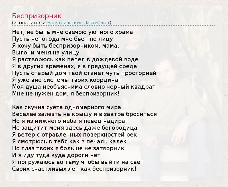 Нет, не быть мне свечою уютного храма Пусть непогода мне бьет по лицу Я хочу быть беспризорником, мама, Выгони меня на улицу Я растворюсь как пепел в дождевой воде Я в других временах, я в грядущей среде Пусть старый дом твой станет чуть просторней Я уже вне системы твоих координат Моя душа необъяснима словно черный квадрат Мне не нужен дом, я беспризорник! Как скучна суета одномерного мира Веселее залезть на крышу и в завтра броситься Но я из нижнего неба я певец надира Не защитит меня здесь даже богородица Я ветер с отравленных поверхностей рек Я смотрюсь в тебя как в печаль калек Но глаз твоих я больше не затворник И я иду туда куда дороги нет Я погружаюсь во тьму чтобы выйти на свет Своих счастливых лет как беспризорник!