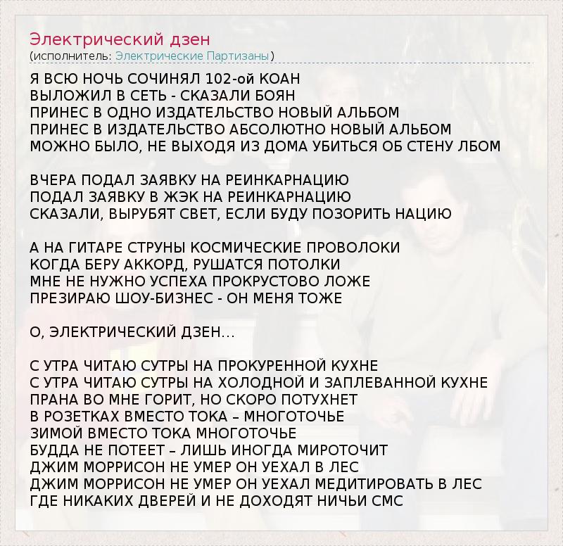 Я ВСЮ НОЧЬ СОЧИНЯЛ 102-ой КОАН ВЫЛОЖИЛ В СЕТЬ - СКАЗАЛИ БОЯН ПРИНЕС В ОДНО ИЗДАТЕЛЬСТВО НОВЫЙ АЛЬБОМ ПРИНЕС В ИЗДАТЕЛЬСТВО АБСОЛЮТНО НОВЫЙ АЛЬБОМ МОЖНО БЫЛО, НЕ ВЫХОДЯ ИЗ ДОМА УБИТЬСЯ ОБ СТЕНУ ЛБОМ ВЧЕРА ПОДАЛ ЗАЯВКУ НА РЕИНКАРНАЦИЮ ПОДАЛ ЗАЯВКУ В ЖЭК НА РЕИНКАРНАЦИЮ СКАЗАЛИ, ВЫРУБЯТ СВЕТ, ЕСЛИ БУДУ ПОЗОРИТЬ НАЦИЮ А НА ГИТАРЕ СТРУНЫ КОСМИЧЕСКИЕ ПРОВОЛОКИ КОГДА БЕРУ АККОРД, РУШАТСЯ ПОТОЛКИ МНЕ НЕ НУЖНО УСПЕХА ПРОКРУСТОВО ЛОЖЕ ПРЕЗИРАЮ ШОУ-БИЗНЕС - ОН МЕНЯ ТОЖЕ О, ЭЛЕКТРИЧЕСКИЙ ДЗЕН… С УТРА ЧИТАЮ СУТРЫ НА ПРОКУРЕННОЙ КУХНЕ С УТРА ЧИТАЮ СУТРЫ НА ХОЛОДНОЙ И ЗАПЛЕВАННОЙ КУХНЕ ПРАНА ВО МНЕ ГОРИТ, НО СКОРО ПОТУХНЕТ В РОЗЕТКАХ ВМЕСТО ТОКА – МНОГОТОЧЬЕ ЗИМОЙ ВМЕСТО ТОКА МНОГОТОЧЬЕ БУДДА НЕ ПОТЕЕТ – ЛИШЬ ИНОГДА МИРОТОЧИТ ДЖИМ МОРРИСОН НЕ УМЕР ОН УЕХАЛ В ЛЕС ДЖИМ МОРРИСОН НЕ УМЕР ОН УЕХАЛ МЕДИТИРОВАТЬ В ЛЕС ГДЕ НИКАКИХ ДВЕРЕЙ И НЕ ДОХОДЯТ НИЧЬИ СМС