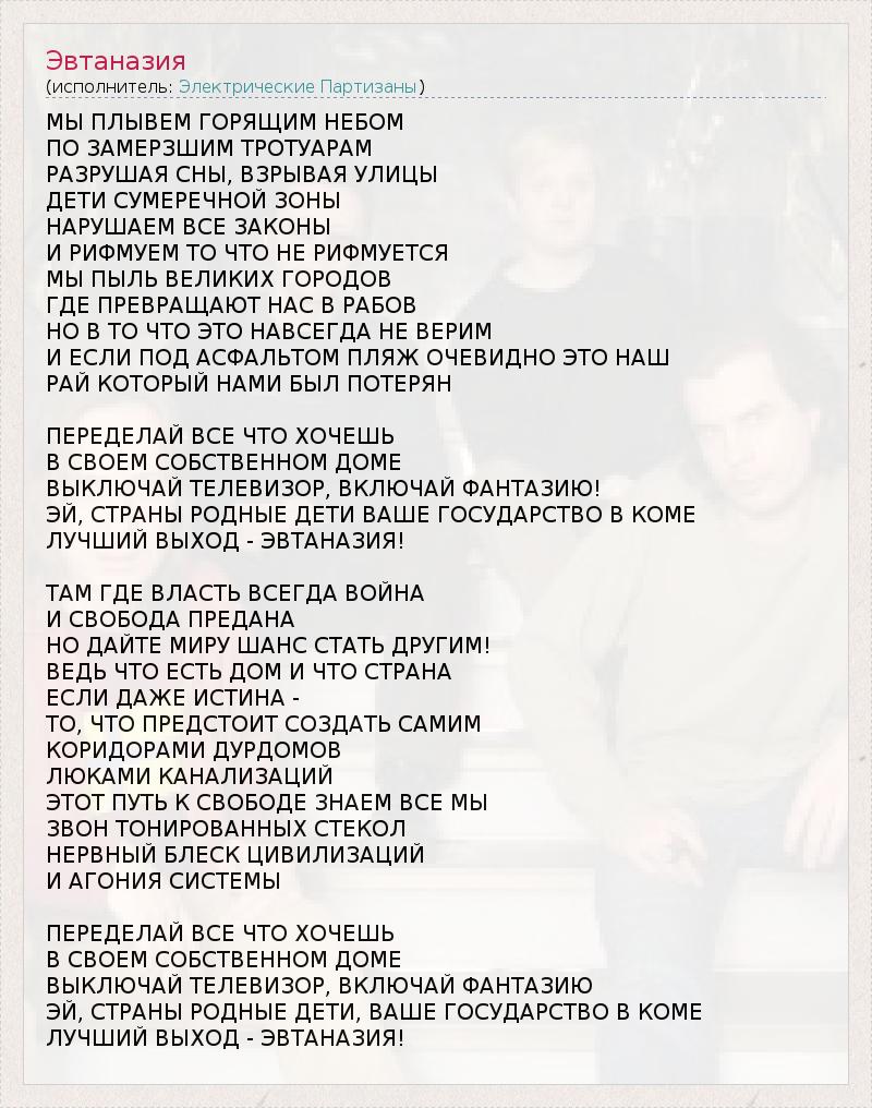 МЫ ПЛЫВЕМ ГОРЯЩИМ НЕБОМ ПО ЗАМЕРЗШИМ ТРОТУАРАМ РАЗРУШАЯ СНЫ, ВЗРЫВАЯ УЛИЦЫ ДЕТИ СУМЕРЕЧНОЙ ЗОНЫ НАРУШАЕМ ВСЕ ЗАКОНЫ И РИФМУЕМ ТО ЧТО НЕ РИФМУЕТСЯ МЫ ПЫЛЬ ВЕЛИКИХ ГОРОДОВ ГДЕ ПРЕВРАЩАЮТ НАС В РАБОВ НО В ТО ЧТО ЭТО НАВСЕГДА НЕ ВЕРИМ И ЕСЛИ ПОД АСФАЛЬТОМ ПЛЯЖ ОЧЕВИДНО ЭТО НАШ РАЙ КОТОРЫЙ НАМИ БЫЛ ПОТЕРЯН ПЕРЕДЕЛАЙ ВСЕ ЧТО ХОЧЕШЬ В СВОЕМ СОБСТВЕННОМ ДОМЕ ВЫКЛЮЧАЙ ТЕЛЕВИЗОР, ВКЛЮЧАЙ ФАНТАЗИЮ! ЭЙ, СТРАНЫ РОДНЫЕ ДЕТИ ВАШЕ ГОСУДАРСТВО В КОМЕ ЛУЧШИЙ ВЫХОД - ЭВТАНАЗИЯ! ТАМ ГДЕ ВЛАСТЬ ВСЕГДА ВОЙНА И СВОБОДА ПРЕДАНА НО ДАЙТЕ МИРУ ШАНС СТАТЬ ДРУГИМ! ВЕДЬ ЧТО ЕСТЬ ДОМ И ЧТО СТРАНА ЕСЛИ ДАЖЕ ИСТИНА - ТО, ЧТО ПРЕДСТОИТ СОЗДАТЬ САМИМ КОРИДОРАМИ ДУРДОМОВ ЛЮКАМИ КАНАЛИЗАЦИЙ ЭТОТ ПУТЬ К СВОБОДЕ ЗНАЕМ ВСЕ МЫ ЗВОН ТОНИРОВАННЫХ СТЕКОЛ НЕРВНЫЙ БЛЕСК ЦИВИЛИЗАЦИЙ И АГОНИЯ СИСТЕМЫ ПЕРЕДЕЛАЙ ВСЕ ЧТО ХОЧЕШЬ В СВОЕМ СОБСТВЕННОМ ДОМЕ ВЫКЛЮЧАЙ ТЕЛЕВИЗОР, ВКЛЮЧАЙ ФАНТАЗИЮ ЭЙ, СТРАНЫ РОДНЫЕ ДЕТИ, ВАШЕ ГОСУДАРСТВО В КОМЕ ЛУЧШИЙ ВЫХОД - ЭВТАНАЗИЯ!