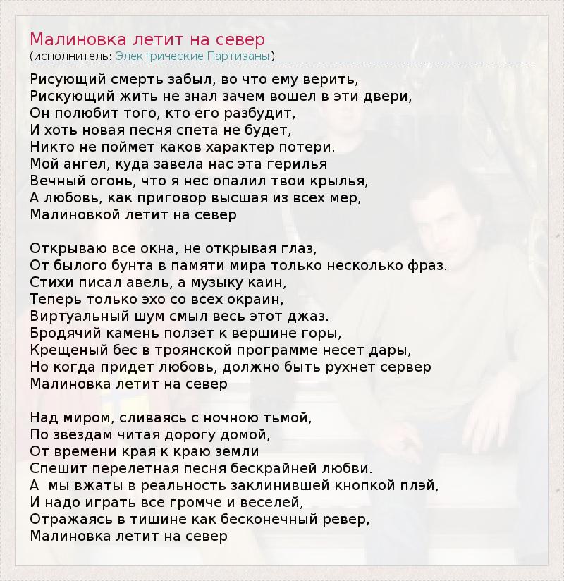 Рисующий смерть забыл, во что ему верить, Рискующий жить не знал зачем вошел в эти двери, Он полюбит того, кто его разбудит, И хоть новая песня спета не будет, Никто не поймет каков характер потери. Мой ангел, куда завела нас эта герилья Вечный огонь, что я нес опалил твои крылья, А любовь, как приговор высшая из всех мер, Малиновкой летит на север Открываю все окна, не открывая глаз, От былого бунта в памяти мира только несколько фраз. Стихи писал авель, а музыку каин, Теперь только эхо со всех окраин, Виртуальный шум смыл весь этот джаз. Бродячий камень ползет к вершине горы, Крещеный бес в троянской программе несет дары, Но когда придет любовь, должно быть рухнет сервер Малиновка летит на север Над миром, сливаясь с ночною тьмой, По звездам читая дорогу домой, От времени края к краю земли Спешит перелетная песня бескрайней любви. А мы вжаты в реальность заклинившей кнопкой плэй, И надо играть все громче и веселей, Отражаясь в тишине как бесконечный ревер, Малиновка летит на север