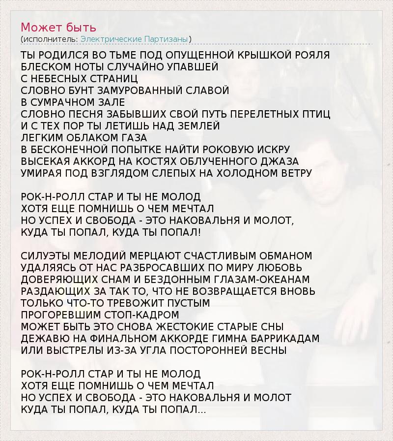 ТЫ РОДИЛСЯ ВО ТЬМЕ ПОД ОПУЩЕННОЙ КРЫШКОЙ РОЯЛЯ БЛЕСКОМ НОТЫ СЛУЧАЙНО УПАВШЕЙ С НЕБЕСНЫХ СТРАНИЦ СЛОВНО БУНТ ЗАМУРОВАННЫЙ СЛАВОЙ В СУМРАЧНОМ ЗАЛЕ СЛОВНО ПЕСНЯ ЗАБЫВШИХ СВОЙ ПУТЬ ПЕРЕЛЕТНЫХ ПТИЦ И С ТЕХ ПОР ТЫ ЛЕТИШЬ НАД ЗЕМЛЕЙ ЛЕГКИМ ОБЛАКОМ ГАЗА В БЕСКОНЕЧНОЙ ПОПЫТКЕ НАЙТИ РОКОВУЮ ИСКРУ ВЫСЕКАЯ АККОРД НА КОСТЯХ ОБЛУЧЕННОГО ДЖАЗА УМИРАЯ ПОД ВЗГЛЯДОМ СЛЕПЫХ НА ХОЛОДНОМ ВЕТРУ РОК-Н-РОЛЛ СТАР И ТЫ НЕ МОЛОД ХОТЯ ЕЩЕ ПОМНИШЬ О ЧЕМ МЕЧТАЛ НО УСПЕХ И СВОБОДА - ЭТО НАКОВАЛЬНЯ И МОЛОТ, КУДА ТЫ ПОПАЛ, КУДА ТЫ ПОПАЛ! СИЛУЭТЫ МЕЛОДИЙ МЕРЦАЮТ СЧАСТЛИВЫМ ОБМАНОМ УДАЛЯЯСЬ ОТ НАС РАЗБРОСАВШИХ ПО МИРУ ЛЮБОВЬ ДОВЕРЯЮЩИХ СНАМ И БЕЗДОННЫМ ГЛАЗАМ-ОКЕАНАМ РАЗДАЮЩИХ ЗА ТАК ТО, ЧТО НЕ ВОЗВРАЩАЕТСЯ ВНОВЬ ТОЛЬКО ЧТО-ТО ТРЕВОЖИТ ПУСТЫМ ПРОГОРЕВШИМ СТОП-КАДРОМ МОЖЕТ БЫТЬ ЭТО СНОВА ЖЕСТОКИЕ СТАРЫЕ СНЫ ДЕЖАВЮ НА ФИНАЛЬНОМ АККОРДЕ ГИМНА БАРРИКАДАМ ИЛИ ВЫСТРЕЛЫ ИЗ-ЗА УГЛА ПОСТОРОННЕЙ ВЕСНЫ РОК-Н-РОЛЛ СТАР И ТЫ НЕ МОЛОД ХОТЯ ЕЩЕ ПОМНИШЬ О ЧЕМ МЕЧТАЛ НО УСПЕХ И СВОБОДА - ЭТО НАКОВАЛЬНЯ И МОЛОТ КУДА ТЫ ПОПАЛ, КУДА ТЫ ПОПАЛ...