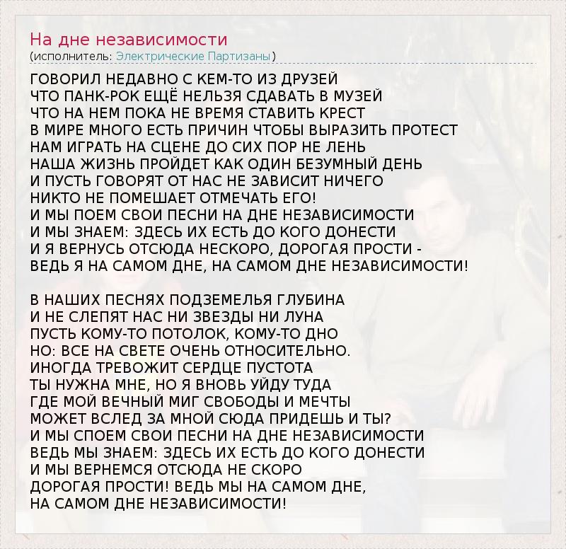 ГОВОРИЛ НЕДАВНО С КЕМ-ТО ИЗ ДРУЗЕЙ ЧТО ПАНК-РОК ЕЩЁ НЕЛЬЗЯ СДАВАТЬ В МУЗЕЙ ЧТО НА НЕМ ПОКА НЕ ВРЕМЯ СТАВИТЬ КРЕСТ В МИРЕ МНОГО ЕСТЬ ПРИЧИН ЧТОБЫ ВЫРАЗИТЬ ПРОТЕСТ НАМ ИГРАТЬ НА СЦЕНЕ ДО СИХ ПОР НЕ ЛЕНЬ НАША ЖИЗНЬ ПРОЙДЕТ КАК ОДИН БЕЗУМНЫЙ ДЕНЬ И ПУСТЬ ГОВОРЯТ ОТ НАС НЕ ЗАВИСИТ НИЧЕГО НИКТО НЕ ПОМЕШАЕТ ОТМЕЧАТЬ ЕГО! И МЫ ПОЕМ СВОИ ПЕСНИ НА ДНЕ НЕЗАВИСИМОСТИ И МЫ ЗНАЕМ: ЗДЕСЬ ИХ ЕСТЬ ДО КОГО ДОНЕСТИ И Я ВЕРНУСЬ ОТСЮДА НЕСКОРО, ДОРОГАЯ ПРОСТИ - ВЕДЬ Я НА САМОМ ДНЕ, НА САМОМ ДНЕ НЕЗАВИСИМОСТИ! В НАШИХ ПЕСНЯХ ПОДЗЕМЕЛЬЯ ГЛУБИНА И НЕ СЛЕПЯТ НАС НИ ЗВЕЗДЫ НИ ЛУНА ПУСТЬ КОМУ-ТО ПОТОЛОК, КОМУ-ТО ДНО НО: ВСЕ НА СВЕТЕ ОЧЕНЬ ОТНОСИТЕЛЬНО. ИНОГДА ТРЕВОЖИТ СЕРДЦЕ ПУСТОТА ТЫ НУЖНА МНЕ, НО Я ВНОВЬ УЙДУ ТУДА ГДЕ МОЙ ВЕЧНЫЙ МИГ СВОБОДЫ И МЕЧТЫ МОЖЕТ ВСЛЕД ЗА МНОЙ СЮДА ПРИДЕШЬ И ТЫ? И МЫ СПОЕМ СВОИ ПЕСНИ НА ДНЕ НЕЗАВИСИМОСТИ ВЕДЬ МЫ ЗНАЕМ: ЗДЕСЬ ИХ ЕСТЬ ДО КОГО ДОНЕСТИ И МЫ ВЕРНЕМСЯ ОТСЮДА НЕ СКОРО ДОРОГАЯ ПРОСТИ! ВЕДЬ МЫ НА САМОМ ДНЕ, НА САМОМ ДНЕ НЕЗАВИСИМОСТИ!