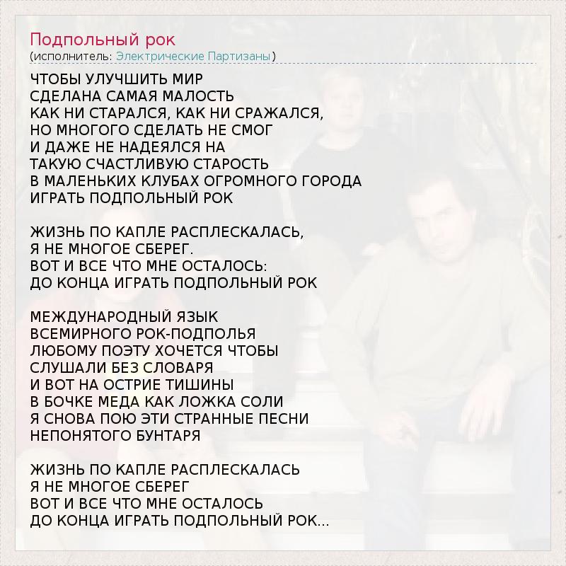ЧТОБЫ УЛУЧШИТЬ МИР СДЕЛАНА САМАЯ МАЛОСТЬ КАК НИ СТАРАЛСЯ, КАК НИ СРАЖАЛСЯ, НО МНОГОГО СДЕЛАТЬ НЕ СМОГ И ДАЖЕ НЕ НАДЕЯЛСЯ НА ТАКУЮ СЧАСТЛИВУЮ СТАРОСТЬ В МАЛЕНЬКИХ КЛУБАХ ОГРОМНОГО ГОРОДА ИГРАТЬ ПОДПОЛЬНЫЙ РОК ЖИЗНЬ ПО КАПЛЕ РАСПЛЕСКАЛАСЬ, Я НЕ МНОГОЕ СБЕРЕГ. ВОТ И ВСЕ ЧТО МНЕ ОСТАЛОСЬ: ДО КОНЦА ИГРАТЬ ПОДПОЛЬНЫЙ РОК МЕЖДУНАРОДНЫЙ ЯЗЫК ВСЕМИРНОГО РОК-ПОДПОЛЬЯ ЛЮБОМУ ПОЭТУ ХОЧЕТСЯ ЧТОБЫ СЛУШАЛИ БЕЗ СЛОВАРЯ И ВОТ НА ОСТРИЕ ТИШИНЫ В БОЧКЕ МЕДА КАК ЛОЖКА СОЛИ Я СНОВА ПОЮ ЭТИ СТРАННЫЕ ПЕСНИ НЕПОНЯТОГО БУНТАРЯ ЖИЗНЬ ПО КАПЛЕ РАСПЛЕСКАЛАСЬ Я НЕ МНОГОЕ СБЕРЕГ ВОТ И ВСЕ ЧТО МНЕ ОСТАЛОСЬ ДО КОНЦА ИГРАТЬ ПОДПОЛЬНЫЙ РОК...