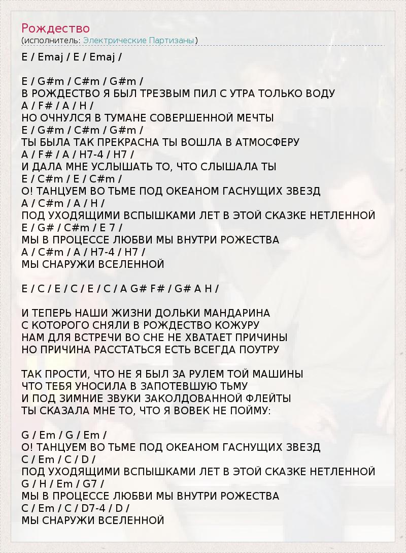 E / Emaj / E / Emaj / E / G#m / C#m / G#m / В РОЖДЕСТВО Я БЫЛ ТРЕЗВЫМ ПИЛ С УТРА ТОЛЬКО ВОДУ A / F# / A / H / НО ОЧНУЛСЯ В ТУМАНЕ СОВЕРШЕННОЙ МЕЧТЫ E / G#m / C#m / G#m / ТЫ БЫЛА ТАК ПРЕКРАСНА ТЫ ВОШЛА В АТМОСФЕРУ A / F# / A / H7-4 / H7 / И ДАЛА МНЕ УСЛЫШАТЬ ТО, ЧТО СЛЫШАЛА ТЫ E / C#m / E / C#m / О! ТАНЦУЕМ ВО ТЬМЕ ПОД ОКЕАНОМ ГАСНУЩИХ ЗВЕЗД A / C#m / A / H / ПОД УХОДЯЩИМИ ВСПЫШКАМИ ЛЕТ В ЭТОЙ СКАЗКЕ НЕТЛЕННОЙ E / G# / C#m / E 7 / МЫ В ПРОЦЕССЕ ЛЮБВИ МЫ ВНУТРИ РОЖЕСТВА A / C#m / A / H7-4 / H7 / МЫ СНАРУЖИ ВСЕЛЕННОЙ E / C / E / C / E / C / A G# F# / G# A H / И ТЕПЕРЬ НАШИ ЖИЗНИ ДОЛЬКИ МАНДАРИНА С КОТОРОГО СНЯЛИ В РОЖДЕСТВО КОЖУРУ НАМ ДЛЯ ВСТРЕЧИ ВО СНЕ НЕ ХВАТАЕТ ПРИЧИНЫ НО ПРИЧИНА РАССТАТЬСЯ ЕСТЬ ВСЕГДА ПОУТРУ ТАК ПРОСТИ, ЧТО НЕ Я БЫЛ ЗА РУЛЕМ ТОЙ МАШИНЫ ЧТО ТЕБЯ УНОСИЛА В ЗАПОТЕВШУЮ ТЬМУ И ПОД ЗИМНИЕ ЗВУКИ ЗАКОЛДОВАННОЙ ФЛЕЙТЫ ТЫ СКАЗАЛА МНЕ ТО, ЧТО Я ВОВЕК НЕ ПОЙМУ: G / Em / G / Em / О! ТАНЦУЕМ ВО ТЬМЕ ПОД ОКЕАНОМ ГАСНУЩИХ ЗВЕЗД C / Em / C / D / ПОД УХОДЯЩИМИ ВСПЫШКАМИ ЛЕТ В ЭТОЙ СКАЗКЕ НЕТЛЕННОЙ G / H / Em / G7 / МЫ В ПРОЦЕССЕ ЛЮБВИ МЫ ВНУТРИ РОЖЕСТВА C / Em / C / D7-4 / D / МЫ СНАРУЖИ ВСЕЛЕННОЙ