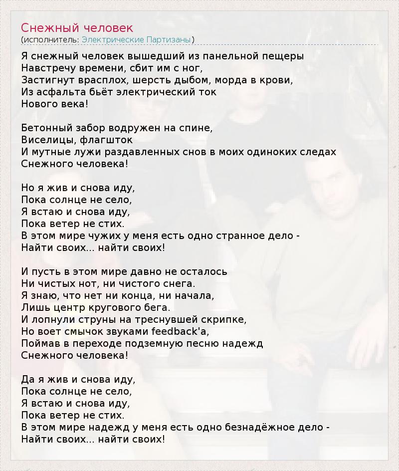 Я снежный человек вышедший из панельной пещеры Навстречу времени, сбит им с ног, Застигнут врасплох, шерсть дыбом, морда в крови, Из асфальта бьёт электрический ток Нового века! Бетонный забор водружен на спине, Виселицы, флагшток И мутные лужи раздавленных снов в моих одиноких следах Снежного человека! Но я жив и снова иду, Пока солнце не село, Я встаю и снова иду, Пока ветер не стих. В этом мире чужих у меня есть одно странное дело - Найти своих... найти своих! И пусть в этом мире давно не осталось Ни чистых нот, ни чистого снега. Я знаю, что нет ни конца, ни начала, Лишь центр кругового бега. И лопнули струны на треснувшей скрипке, Но воет смычок звуками feedback'а, Поймав в переходе подземную песню надежд Снежного человека! Да я жив и снова иду, Пока солнце не село, Я встаю и снова иду, Пока ветер не стих. В этом мире надежд у меня есть одно безнадёжное дело - Найти своих... найти своих!