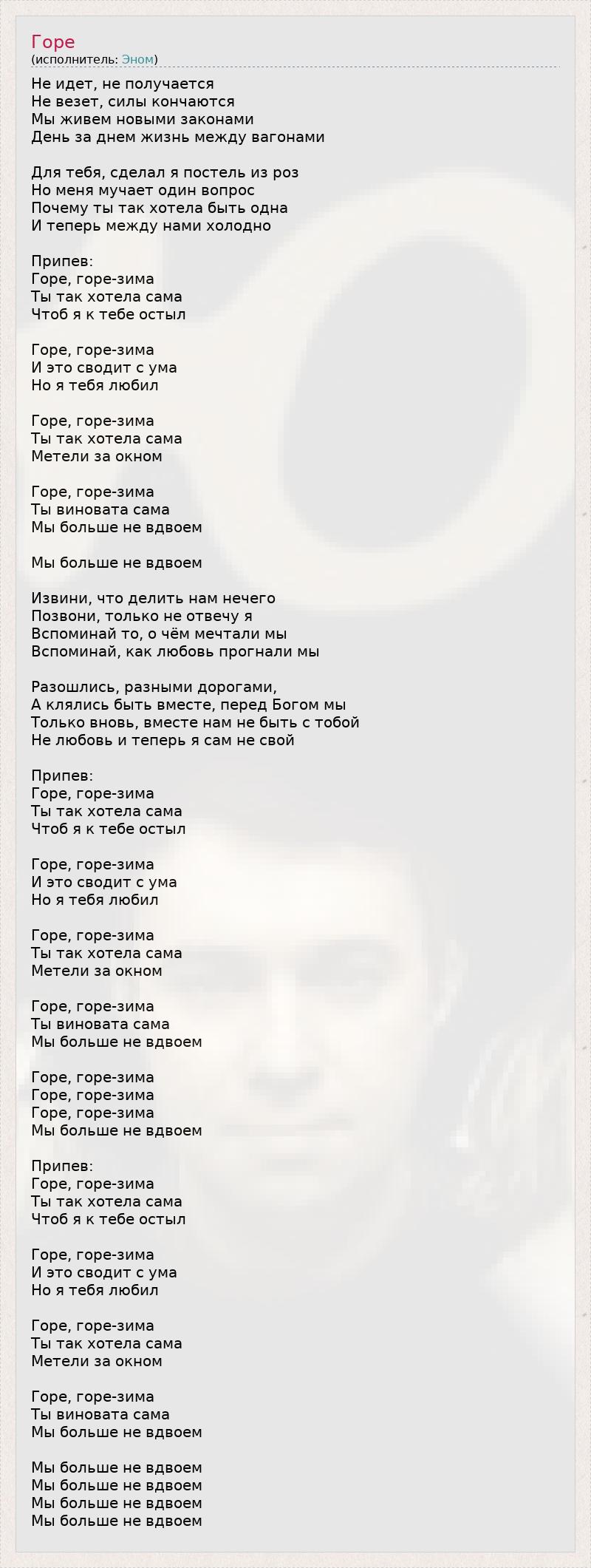Не идет, не получается Не везет, силы кончаются Мы живем новыми законами День за днем жизнь между вагонами Для тебя, сделал я постель из роз Но меня мучает один вопрос Почему ты так хотела быть одна И теперь между нами холодно Припев: Горе, горе-зима Ты так хотела сама Чтоб я к тебе остыл Горе, горе-зима И это сводит с ума Но я тебя любил Горе, горе-зима Ты так хотела сама Метели за окном Горе, горе-зима Ты виновата сама Мы больше не вдвоем Мы больше не вдвоем Извини, что делить нам нечего Позвони, только не отвечу я Вспоминай то, о чём мечтали мы Вспоминай, как любовь прогнали мы Разошлись, разными дорогами, А клялись быть вместе, перед Богом мы Только вновь, вместе нам не быть с тобой Не любовь и теперь я сам не свой Припев: Горе, горе-зима Ты так хотела сама Чтоб я к тебе остыл Горе, горе-зима И это сводит с ума Но я тебя любил Горе, горе-зима Ты так хотела сама Метели за окном Горе, горе-зима Ты виновата сама Мы больше не вдвоем Горе, горе-зима Горе, горе-зима Горе, горе-зима Мы больше не вдвоем Припев: Горе, горе-зима Ты так хотела сама Чтоб я к тебе остыл Горе, горе-зима И это сводит с ума Но я тебя любил Горе, горе-зима Ты так хотела сама Метели за окном Горе, горе-зима Ты виновата сама Мы больше не вдвоем Мы больше не вдвоем Мы больше не вдвоем Мы больше не вдвоем Мы больше не вдвоем