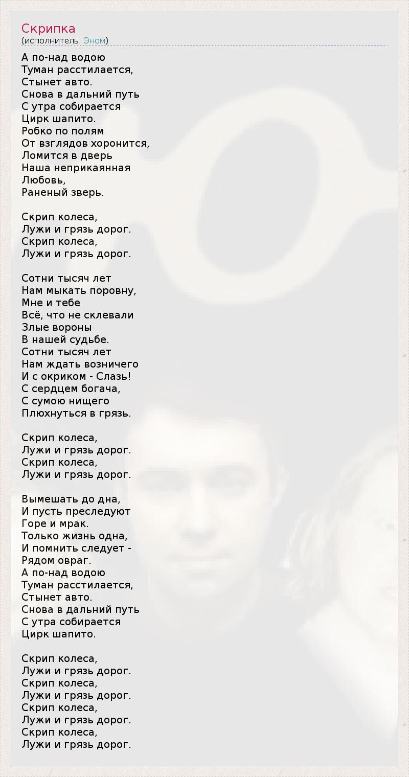 А по-над водою Туман расстилается, Стынет авто. Снова в дальний путь С утра собирается Цирк шапито. Робко по полям От взглядов хоронится, Ломится в дверь Наша неприкаянная Любовь, Раненый зверь. Скрип колеса, Лужи и грязь дорог. Скрип колеса, Лужи и грязь дорог. Сотни тысяч лет Нам мыкать поровну, Мне и тебе Всё, что не склевали Злые вороны В нашей судьбе. Сотни тысяч лет Нам ждать возничего И с окриком - Слазь! С сердцем богача, С сумою нищего Плюхнуться в грязь. Скрип колеса, Лужи и грязь дорог. Скрип колеса, Лужи и грязь дорог. Вымешать до дна, И пусть преследуют Горе и мрак. Только жизнь одна, И помнить следует - Рядом овраг. А по-над водою Туман расстилается, Стынет авто. Снова в дальний путь С утра собирается Цирк шапито. Скрип колеса, Лужи и грязь дорог. Скрип колеса, Лужи и грязь дорог. Скрип колеса, Лужи и грязь дорог. Скрип колеса, Лужи и грязь дорог.