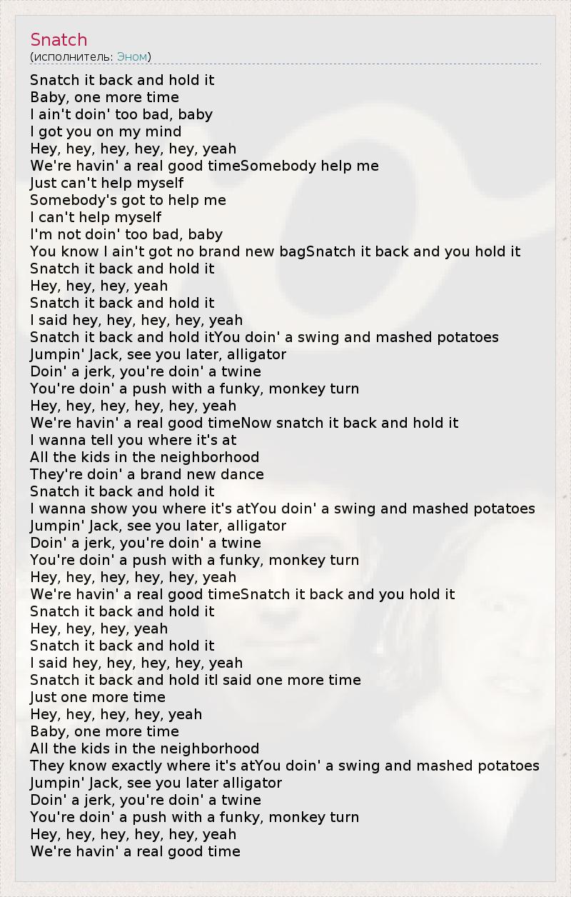 Snatch it back and hold it Baby, one more time I ain't doin' too bad, baby I got you on my mind Hey, hey, hey, hey, hey, yeah We're havin' a real good timeSomebody help me Just can't help myself Somebody's got to help me I can't help myself I'm not doin' too bad, baby You know I ain't got no brand new bagSnatch it back and you hold it Snatch it back and hold it Hey, hey, hey, yeah Snatch it back and hold it I said hey, hey, hey, hey, yeah Snatch it back and hold itYou doin' a swing and mashed potatoes Jumpin' Jack, see you later, alligator Doin' a jerk, you're doin' a twine You're doin' a push with a funky, monkey turn Hey, hey, hey, hey, hey, yeah We're havin' a real good timeNow snatch it back and hold it I wanna tell you where it's at All the kids in the neighborhood They're doin' a brand new dance Snatch it back and hold it I wanna show you where it's atYou doin' a swing and mashed potatoes Jumpin' Jack, see you later, alligator Doin' a jerk, you're doin' a twine You're doin' a push with a funky, monkey turn Hey, hey, hey, hey, hey, yeah We're havin' a real good timeSnatch it back and you hold it Snatch it back and hold it Hey, hey, hey, yeah Snatch it back and hold it I said hey, hey, hey, hey, yeah Snatch it back and hold itI said one more time Just one more time Hey, hey, hey, hey, yeah Baby, one more time All the kids in the neighborhood They know exactly where it's atYou doin' a swing and mashed potatoes Jumpin' Jack, see you later alligator Doin' a jerk, you're doin' a twine You're doin' a push with a funky, monkey turn Hey, hey, hey, hey, hey, yeah We're havin' a real good time