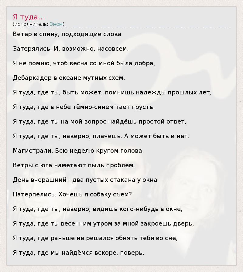 Ветер в спину, подходящие слова Затерялись. И, возможно, насовсем. Я не помню, чтоб весна со мной была добра, Дебаркадер в океане мутных схем. Я туда, где ты, быть может, помнишь надежды прошлых лет, Я туда, где в небе тёмно-синем тает грусть. Я туда, где ты на мой вопрос найдёшь простой ответ, Я туда, где ты, наверно, плачешь. А может быть и нет. Магистрали. Всю неделю кругом голова. Ветры с юга наметают пыль проблем. День вчерашний - два пустых стакана у окна Натерпелись. Хочешь я собаку съем? Я туда, где ты, наверно, видишь кого-нибудь в окне, Я туда, где ты весенним утром за мной закроешь дверь, Я туда, где раньше не решался обнять тебя во сне, Я туда, где мы найдёмся вскоре, поверь.