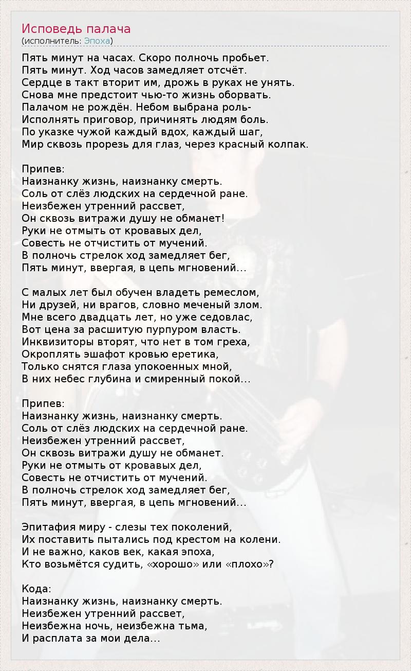 Пять минут на часах. Скоро полночь пробьет. Пять минут. Ход часов замедляет отсчёт. Сердце в такт вторит им, дрожь в руках не унять. Снова мне предстоит чью-то жизнь оборвать. Палачом не рождён. Небом выбрана роль- Исполнять приговор, причинять людям боль. По указке чужой каждый вдох, каждый шаг, Мир сквозь прорезь для глаз, через красный колпак. Припев: Наизнанку жизнь, наизнанку смерть. Соль от слёз людских на сердечной ране. Неизбежен утренний рассвет, Он сквозь витражи душу не обманет! Руки не отмыть от кровавых дел, Совесть не отчистить от мучений. В полночь стрелок ход замедляет бег, Пять минут, ввергая, в цепь мгновений… С малых лет был обучен владеть ремеслом, Ни друзей, ни врагов, словно меченый злом. Мне всего двадцать лет, но уже седовлас, Вот цена за расшитую пурпуром власть. Инквизиторы вторят, что нет в том греха, Окроплять эшафот кровью еретика, Только снятся глаза упокоенных мной, В них небес глубина и смиренный покой… Припев: Наизнанку жизнь, наизнанку смерть. Соль от слёз людских на сердечной ране. Неизбежен утренний рассвет, Он сквозь витражи душу не обманет. Руки не отмыть от кровавых дел, Совесть не отчистить от мучений. В полночь стрелок ход замедляет бег, Пять минут, ввергая, в цепь мгновений… Эпитафия миру - слезы тех поколений, Их поставить пытались под крестом на колени. И не важно, каков век, какая эпоха, Кто возьмётся судить, «хорошо» или «плохо»? Кода: Наизнанку жизнь, наизнанку смерть. Неизбежен утренний рассвет, Неизбежна ночь, неизбежна тьма, И расплата за мои дела…