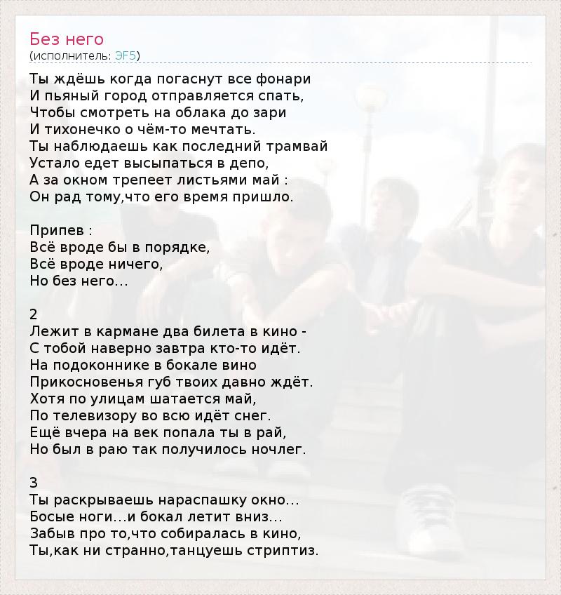 Ты ждёшь когда погаснут все фонари И пьяный город отправляется спать, Чтобы смотреть на облака до зари И тихонечко о чём-то мечтать. Ты наблюдаешь как последний трамвай Устало едет высыпаться в депо, А за окном трепеет листьями май : Он рад тому,что его время пришло. Припев : Всё вроде бы в порядке, Всё вроде ничего, Но без него… 2 Лежит в кармане два билета в кино - С тобой наверно завтра кто-то идёт. На подоконнике в бокале вино Прикосновенья губ твоих давно ждёт. Хотя по улицам шатается май, По телевизору во всю идёт снег. Ещё вчера на век попала ты в рай, Но был в раю так получилось ночлег. 3 Ты раскрываешь нараспашку окно… Босые ноги…и бокал летит вниз… Забыв про то,что собиралась в кино, Ты,как ни странно,танцуешь стриптиз.