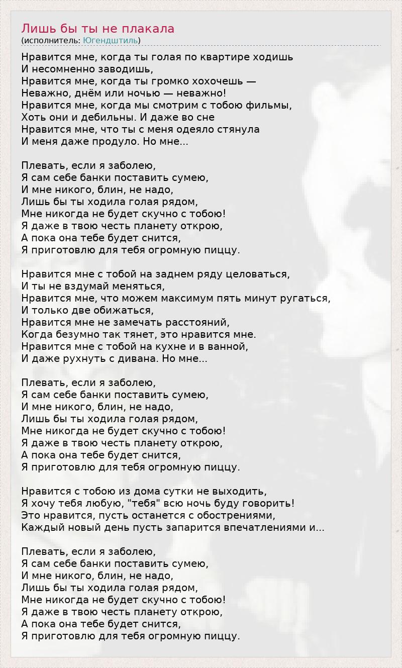 Нравится мне, когда ты голая по квартире ходишь И несомненно заводишь, Нравится мне, когда ты громко хохочешь — Неважно, днём или ночью — неважно! Нравится мне, когда мы смотрим с тобою фильмы, Хоть они и дебильны. И даже во сне Нравится мне, что ты с меня одеяло стянула И меня даже продуло. Но мне... Плевать, если я заболею, Я сам себе банки поставить сумею, И мне никого, блин, не надо, Лишь бы ты ходила голая рядом, Мне никогда не будет скучно с тобою! Я даже в твою честь планету открою, А пока она тебе будет снится, Я приготовлю для тебя огромную пиццу. Нравится мне с тобой на заднем ряду целоваться, И ты не вздумай меняться, Нравится мне, что можем максимум пять минут ругаться, И только две обижаться, Нравится мне не замечать расстояний, Когда безумно так тянет, это нравится мне. Нравится мне с тобой на кухне и в ванной, И даже рухнуть с дивана. Но мне... Плевать, если я заболею, Я сам себе банки поставить сумею, И мне никого, блин, не надо, Лишь бы ты ходила голая рядом, Мне никогда не будет скучно с тобою! Я даже в твою честь планету открою, А пока она тебе будет снится, Я приготовлю для тебя огромную пиццу. Нравится с тобою из дома сутки не выходить, Я хочу тебя любую, "тебя" всю ночь буду говорить! Это нравится, пусть останется с обострениями, Каждый новый день пусть запарится впечатлениями и... Плевать, если я заболею, Я сам себе банки поставить сумею, И мне никого, блин, не надо, Лишь бы ты ходила голая рядом, Мне никогда не будет скучно с тобою! Я даже в твою честь планету открою, А пока она тебе будет снится, Я приготовлю для тебя огромную пиццу.