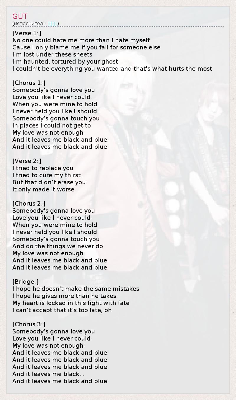 [Verse 1:] No one could hate me more than I hate myself Cause I only blame me if you fall for someone else I'm lost under these sheets I'm haunted, tortured by your ghost I couldn't be everything you wanted and that's what hurts the most [Chorus 1:] Somebody's gonna love you Love you like I never could When you were mine to hold I never held you like I should Somebody's gonna touch you In places I could not get to My love was not enough And it leaves me black and blue And it leaves me black and blue [Verse 2:] I tried to replace you I tried to cure my thirst But that didn't erase you It only made it worse [Chorus 2:] Somebody's gonna love you Love you like I never could When you were mine to hold I never held you like I should Somebody's gonna touch you And do the things we never do My love was not enough And it leaves me black and blue And it leaves me black and blue [Bridge:] I hope he doesn't make the same mistakes I hope he gives more than he takes My heart is locked in this fight with fate I can't accept that it's too late, oh [Chorus 3:] Somebody's gonna love you Love you like I never could My love was not enough And it leaves me black and blue And it leaves me black and blue And it leaves me black and blue And it leaves me black... And it leaves me black and blue