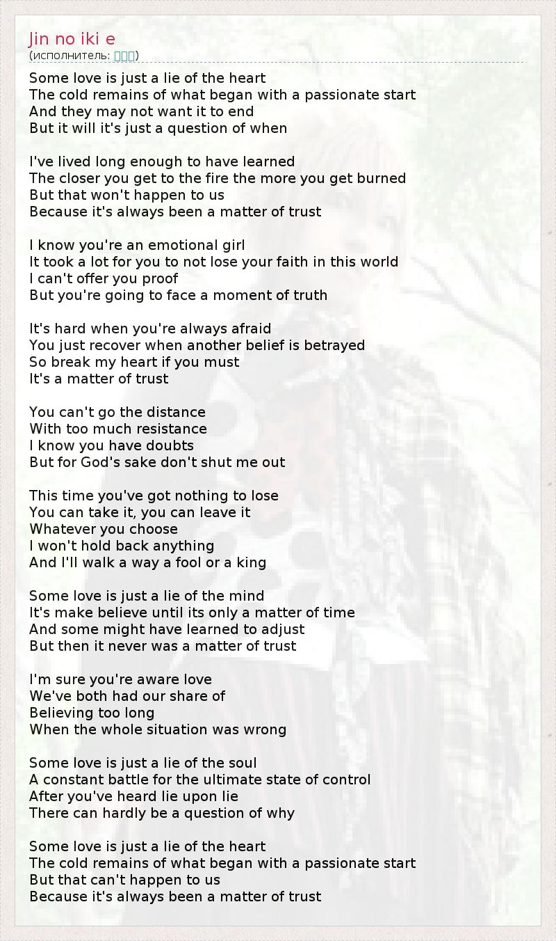 Иногда любовь – это просто ложь сердца, Холодные остатки прежней страсти. И как не пытайся ее сохранить, Конец неизбежен, это просто дело времени. Я достаточно прожил, чтобы понять Чем ближе подойдешь к огню, тем больше обожжешься Но с нами такого не случится Потому что здесь дело всегда было в доверии Я знаю, что ты эмоциональная девушка. Тебе стоило многого не потерять свою веру в этот мир. Я не могу дать тебе доказательств, Но тебе должна открыться истина. Тяжело, когда постоянно боишься, Но стоит тебе прийти в себя, как случается очередное крушение веры. Так что разбей мне сердце, если не можешь иначе, Это вопрос доверия. Нельзя пройти путь С таким сопротивлением. Я знаю, у тебя есть сомнения, Но ради всего святого, не отбрасывай меня! В это раз тебе нечего терять, Сказать «да», сказать «нет», – Выбор за тобой. Я не стану ничего скрывать, И я стану принцем или нищим. Иногда любовь – это ложь разума, Самообман, проходящий со временем. И пусть кто-то и может к такому приспособиться, Но доверия здесь уже никогда не будет. Я уверен, ты знаешь, что такое любовь. Мы оба понимаем, что значит Верить слишком долго В ложь и обман. Иногда любовь – это просто ложь души, Постоянная борьба за тотальный контроль. И после того, как слышишь одну ложь за другой, Тут уже не может быть вопроса «Почему?» Иногда любовь – это просто ложь сердца, Холодные остатки прежней страсти. Но с нами такого не случится, Потому что здесь дело всегда было в доверии.
