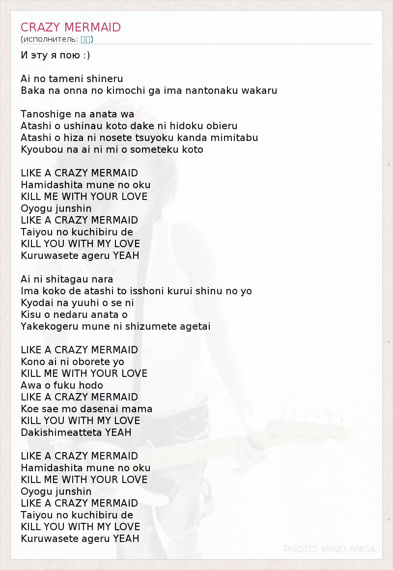 И эту я пою :) Ai no tameni shineru Baka na onna no kimochi ga ima nantonaku wakaru Tanoshige na anata wa Atashi o ushinau koto dake ni hidoku obieru Atashi o hiza ni nosete tsuyoku kanda mimitabu Kyoubou na ai ni mi o someteku koto LIKE A CRAZY MERMAID Hamidashita mune no oku KILL ME WITH YOUR LOVE Oyogu junshin LIKE A CRAZY MERMAID Taiyou no kuchibiru de KILL YOU WITH MY LOVE Kuruwasete ageru YEAH Ai ni shitagau nara Ima koko de atashi to isshoni kurui shinu no yo Kyodai na yuuhi o se ni Kisu o nedaru anata o Yakekogeru mune ni shizumete agetai LIKE A CRAZY MERMAID Kono ai ni oborete yo KILL ME WITH YOUR LOVE Awa o fuku hodo LIKE A CRAZY MERMAID Koe sae mo dasenai mama KILL YOU WITH MY LOVE Dakishimeatteta YEAH LIKE A CRAZY MERMAID Hamidashita mune no oku KILL ME WITH YOUR LOVE Oyogu junshin LIKE A CRAZY MERMAID Taiyou no kuchibiru de KILL YOU WITH MY LOVE Kuruwasete ageru YEAH