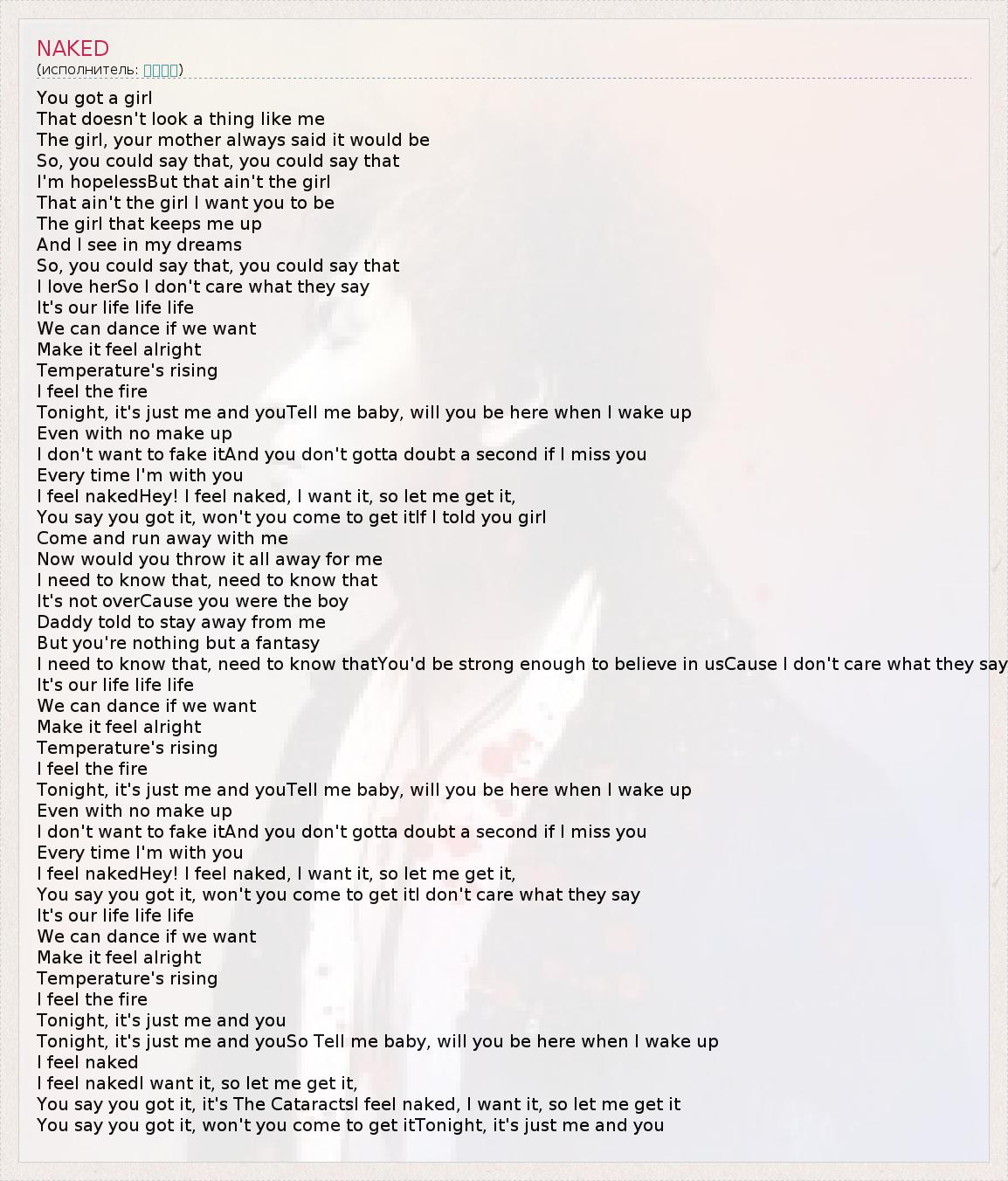 You got a girl That doesn't look a thing like me The girl, your mother always said it would be So, you could say that, you could say that I'm hopelessBut that ain't the girl That ain't the girl I want you to be The girl that keeps me up And I see in my dreams So, you could say that, you could say that I love herSo I don't care what they say It's our life life life We can dance if we want Make it feel alright Temperature's rising I feel the fire Tonight, it's just me and youTell me baby, will you be here when I wake up Even with no make up I don't want to fake itAnd you don't gotta doubt a second if I miss you Every time I'm with you I feel nakedHey! I feel naked, I want it, so let me get it, You say you got it, won't you come to get itIf I told you girl Come and run away with me Now would you throw it all away for me I need to know that, need to know that It's not overCause you were the boy Daddy told to stay away from me But you're nothing but a fantasy I need to know that, need to know thatYou'd be strong enough to believe in usCause I don't care what they say It's our life life life We can dance if we want Make it feel alright Temperature's rising I feel the fire Tonight, it's just me and youTell me baby, will you be here when I wake up Even with no make up I don't want to fake itAnd you don't gotta doubt a second if I miss you Every time I'm with you I feel nakedHey! I feel naked, I want it, so let me get it, You say you got it, won't you come to get itI don't care what they say It's our life life life We can dance if we want Make it feel alright Temperature's rising I feel the fire Tonight, it's just me and you Tonight, it's just me and youSo Tell me baby, will you be here when I wake up I feel naked I feel nakedI want it, so let me get it, You say you got it, it's The CataractsI feel naked, I want it, so let me get it You say you got it, won't you come to get itTonight, it's just me and you