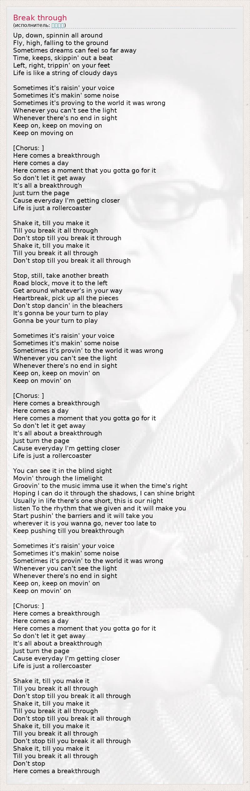 Up, down, spinnin all around Fly, high, falling to the ground Sometimes dreams can feel so far away Time, keeps, skippin' out a beat Left, right, trippin' on your feet Life is like a string of cloudy days Sometimes it's raisin' your voice Sometimes it's makin' some noise Sometimes it's proving to the world it was wrong Whenever you can't see the light Whenever there's no end in sight Keep on, keep on moving on Keep on moving on [Chorus: ] Here comes a breakthrough Here comes a day Here comes a moment that you gotta go for it So don't let it get away It's all a breakthrough Just turn the page Cause everyday I'm getting closer Life is just a rollercoaster Shake it, till you make it Till you break it all through Don't stop till you break it through Shake it, till you make it Till you break it all through Don't stop till you break it all through Stop, still, take another breath Road block, move it to the left Get around whatever's in your way Heartbreak, pick up all the pieces Don't stop dancin' in the bleachers It's gonna be your turn to play Gonna be your turn to play Sometimes it's raisin' your voice Sometimes it's makin' some noise Sometimes it's provin' to the world it was wrong Whenever you can't see the light Whenever there's no end in sight Keep on, keep on movin' on Keep on movin' on [Chorus: ] Here comes a breakthrough Here comes a day Here comes a moment that you gotta go for it So don't let it get away It's all about a breakthrough Just turn the page Cause everyday I'm getting closer Life is just a rollercoaster You can see it in the blind sight Movin' through the limelight Groovin' to the music imma use it when the time's right Hoping I can do it through the shadows, I can shine bright Usually in life there's one short, this is our night listen To the rhythm that we given and it will make you Start pushin' the barriers and it will take you wherever it is you wanna go, never too late to Keep pushing till you breakthrough Sometimes it's raisin' your voice Sometimes it's makin' some noise Sometimes it's provin' to the world it was wrong Whenever you can't see the light Whenever there's no end in sight Keep on, keep on movin' on Keep on movin' on [Chorus: ] Here comes a breakthrough Here comes a day Here comes a moment that you gotta go for it So don't let it get away It's all about a breakthrough Just turn the page Cause everyday I'm getting closer Life is just a rollercoaster Shake it, till you make it Till you break it all through Don't stop till you break it all through Shake it, till you make it Till you break it all through Don't stop till you break it all through Shake it, till you make it Till you break it all through Don't stop till you break it all through Shake it, till you make it Till you break it all through Don't stop Here comes a breakthrough
