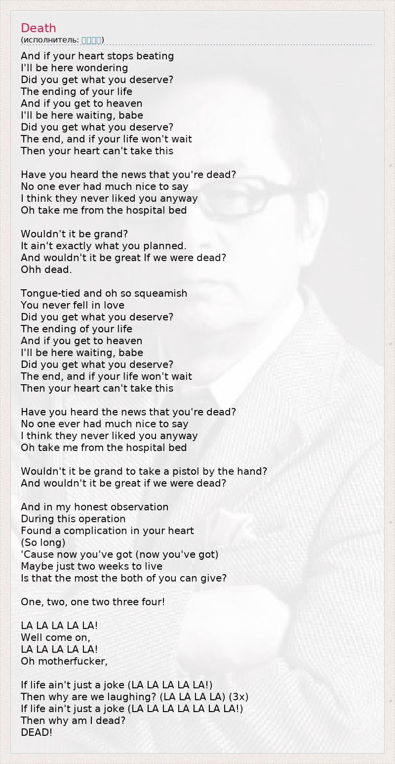 And if your heart stops beating I'll be here wondering Did you get what you deserve? The ending of your life And if you get to heaven I'll be here waiting, babe Did you get what you deserve? The end, and if your life won't wait Then your heart can't take this Have you heard the news that you're dead? No one ever had much nice to say I think they never liked you anyway Oh take me from the hospital bed Wouldn't it be grand? It ain't exactly what you planned. And wouldn't it be great If we were dead? Ohh dead. Tongue-tied and oh so squeamish You never fell in love Did you get what you deserve? The ending of your life And if you get to heaven I'll be here waiting, babe Did you get what you deserve? The end, and if your life won't wait Then your heart can't take this Have you heard the news that you're dead? No one ever had much nice to say I think they never liked you anyway Oh take me from the hospital bed Wouldn't it be grand to take a pistol by the hand? And wouldn't it be great if we were dead? And in my honest observation During this operation Found a complication in your heart (So long) 'Cause now you've got (now you've got) Maybe just two weeks to live Is that the most the both of you can give? One, two, one two three four! LA LA LA LA LA! Well come on, LA LA LA LA LA! Oh motherfucker, If life ain't just a joke (LA LA LA LA LA!) Then why are we laughing? (LA LA LA LA) (3х) If life ain't just a joke (LA LA LA LA LA LA LA!) Then why am I dead? DEAD!