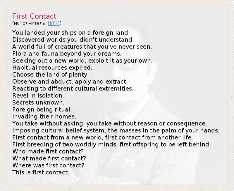 You landed your ships on a foreign land. Discovered worlds you didn't understand. A world full of creatures that you've never seen. Flora and fauna beyond your dreams. Seeking out a new world, exploit it as your own. Habitual resources expired. Choose the land of plenty. Observe and abduct, apply and extract. Reacting to different cultural extremities. Revel in isolation. Secrets unknown. Foreign being ritual. Invading their homes. You take without asking, you take without reason or consequence. Imposing cultural belief system, the masses in the palm of your hands. First contact from a new world, first contact from another life. First breeding of two worldly minds, first offspring to be left behind. Who made first contact? What made first contact? Where was first contact? This is first contact.
