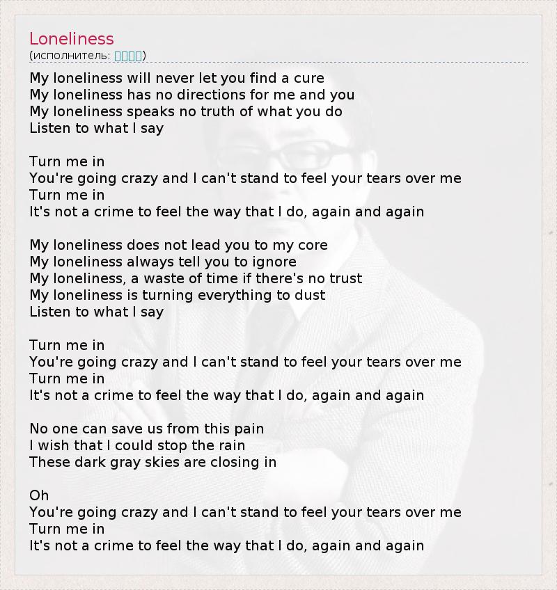 My loneliness will never let you find a cure My loneliness has no directions for me and you My loneliness speaks no truth of what you do Listen to what I say Turn me in You're going crazy and I can't stand to feel your tears over me Turn me in It's not a crime to feel the way that I do, again and again My loneliness does not lead you to my core My loneliness always tell you to ignore My loneliness, a waste of time if there's no trust My loneliness is turning everything to dust Listen to what I say Turn me in You're going crazy and I can't stand to feel your tears over me Turn me in It's not a crime to feel the way that I do, again and again No one can save us from this pain I wish that I could stop the rain These dark gray skies are closing in Oh You're going crazy and I can't stand to feel your tears over me Turn me in It's not a crime to feel the way that I do, again and again