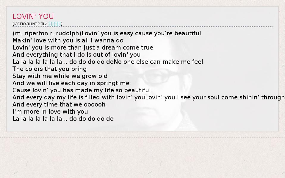 (m. riperton r. rudolph)Lovin' you is easy cause you're beautiful Makin' love with you is all I wanna do Lovin' you is more than just a dream come true And everything that I do is out of lovin' you La la la la la la la... do do do do doNo one else can make me feel The colors that you bring Stay with me while we grow old And we will live each day in springtime Cause lovin' you has made my life so beautiful And every day my life is filled with lovin' youLovin' you I see your soul come shinin' through And every time that we oooooh I'm more in love with you La la la la la la la... do do do do do
