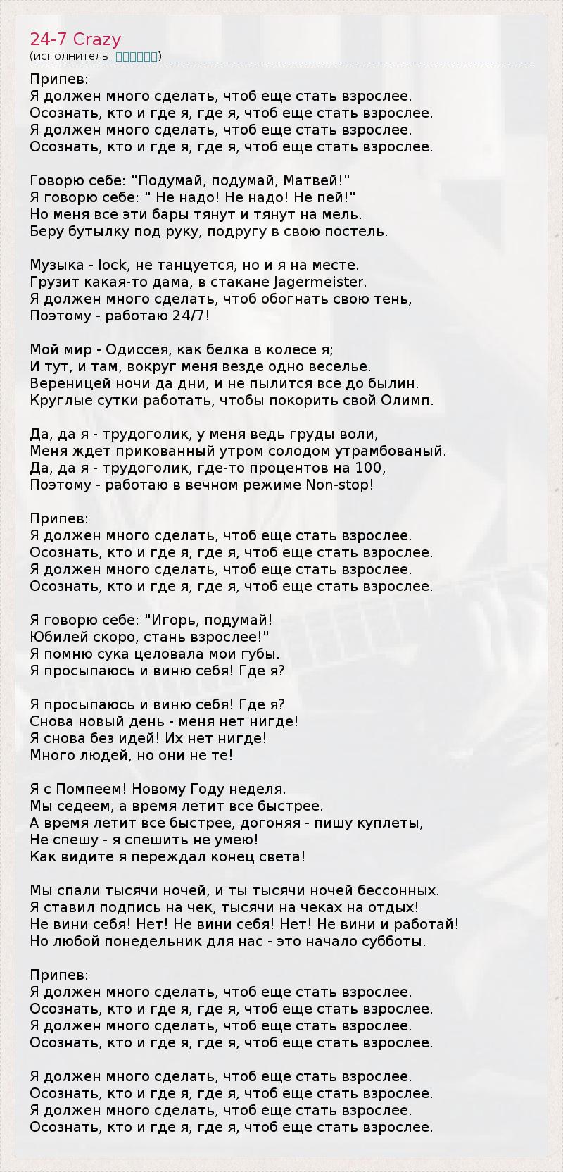 Припев: Я должен много сделать, чтоб еще стать взрослее. Осознать, кто и где я, где я, чтоб еще стать взрослее. Я должен много сделать, чтоб еще стать взрослее. Осознать, кто и где я, где я, чтоб еще стать взрослее. Говорю себе: "Подумай, подумай, Матвей!" Я говорю себе: " Не надо! Не надо! Не пей!" Но меня все эти бары тянут и тянут на мель. Беру бутылку под руку, подругу в свою постель. Музыка - lock, не танцуется, но и я на месте. Грузит какая-то дама, в стакане Jagermeister. Я должен много сделать, чтоб обогнать свою тень, Поэтому - работаю 24/7! Мой мир - Одиссея, как белка в колесе я; И тут, и там, вокруг меня везде одно веселье. Вереницей ночи да дни, и не пылится все до былин. Круглые сутки работать, чтобы покорить свой Олимп. Да, да я - трудоголик, у меня ведь груды воли, Меня ждет прикованный утром солодом утрамбованый. Да, да я - трудоголик, где-то процентов на 100, Поэтому - работаю в вечном режиме Non-stop! Припев: Я должен много сделать, чтоб еще стать взрослее. Осознать, кто и где я, где я, чтоб еще стать взрослее. Я должен много сделать, чтоб еще стать взрослее. Осознать, кто и где я, где я, чтоб еще стать взрослее. Я говорю себе: "Игорь, подумай! Юбилей скоро, стань взрослее!" Я помню сука целовала мои губы. Я просыпаюсь и виню себя! Где я? Я просыпаюсь и виню себя! Где я? Снова новый день - меня нет нигде! Я снова без идей! Их нет нигде! Много людей, но они не те! Я с Помпеем! Новому Году неделя. Мы седеем, а время летит все быстрее. А время летит все быстрее, догоняя - пишу куплеты, Не спешу - я спешить не умею! Как видите я переждал конец света! Мы спали тысячи ночей, и ты тысячи ночей бессонных. Я ставил подпись на чек, тысячи на чеках на отдых! Не вини себя! Нет! Не вини себя! Нет! Не вини и работай! Но любой понедельник для нас - это начало субботы. Припев: Я должен много сделать, чтоб еще стать взрослее. Осознать, кто и где я, где я, чтоб еще стать взрослее. Я должен много сделать, чтоб еще стать взрослее. Осознать, кто и где я, где я, чтоб еще стать взрослее. Я должен много сделать, чтоб еще стать взрослее. Осознать, кто и где я, где я, чтоб еще стать взрослее. Я должен много сделать, чтоб еще стать взрослее. Осознать, кто и где я, где я, чтоб еще стать взрослее.