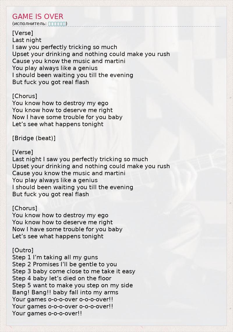 [Verse] Last night I saw you perfectly tricking so much Upset your drinking and nothing could make you rush Cause you know the music and martini You play always like a genius I should been waiting you till the evening But fuck you got real flash [Chorus] You know how to destroy my ego You know how to deserve me right Now I have some trouble for you baby Let’s see what happens tonight [Bridge (beat)] [Verse] Last night I saw you perfectly tricking so much Upset your drinking and nothing could make you rush Cause you know the music and martini You play always like a genius I should been waiting you till the evening But fuck you got real flash [Chorus] You know how to destroy my ego You know how to deserve me right Now I have some trouble for you baby Let’s see what happens tonight [Outro] Step 1 I’m taking all my guns Step 2 Promises I’ll be gentle to you Step 3 baby come close to me take it easy Step 4 baby let’s died on the floor Step 5 want to make you step on my side Bang! Bang!! baby fall into my arms Your games o-o-o-over o-o-o-over!! Your games o-o-o-over o-o-o-over!! Your games o-o-o-over!!