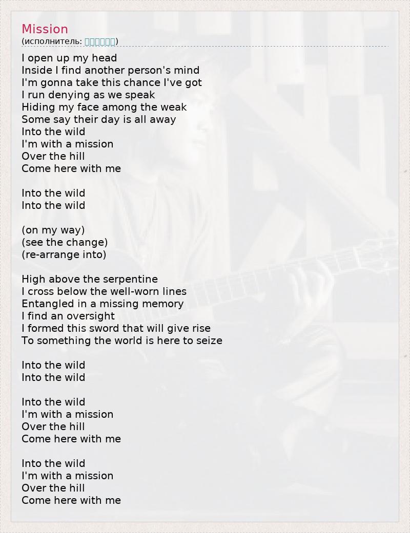 I open up my head Inside I find another person's mind I'm gonna take this chance I've got I run denying as we speak Hiding my face among the weak Some say their day is all away Into the wild I'm with a mission Over the hill Come here with me Into the wild Into the wild (on my way) (see the change) (re-arrange into) High above the serpentine I cross below the well-worn lines Entangled in a missing memory I find an oversight I formed this sword that will give rise To something the world is here to seize Into the wild Into the wild Into the wild I'm with a mission Over the hill Come here with me Into the wild I'm with a mission Over the hill Come here with me