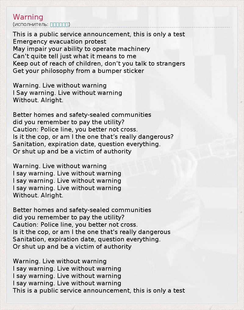 This is a public service announcement, this is only a test Emergency evacuation protest May impair your ability to operate machinery Can't quite tell just what it means to me Keep out of reach of children, don't you talk to strangers Get your philosophy from a bumper sticker Warning. Live without warning I Say warning. Live without warning Without. Alright. Better homes and safety-sealed communities did you remember to pay the utility? Caution: Police line, you better not cross. Is it the cop, or am I the one that’s really dangerous? Sanitation, expiration date, question everything. Or shut up and be a victim of authority Warning. Live without warning I say warning. Live without warning I say warning. Live without warning I say warning. Live without warning Without. Alright. Better homes and safety-sealed communities did you remember to pay the utility? Caution: Police line, you better not cross. Is it the cop, or am I the one that's really dangerous Sanitation, expiration date, question everything. Or shut up and be a victim of authority Warning. Live without warning I say warning. Live without warning I say warning. Live without warning I say warning. Live without warning This is a public service announcement, this is only a test