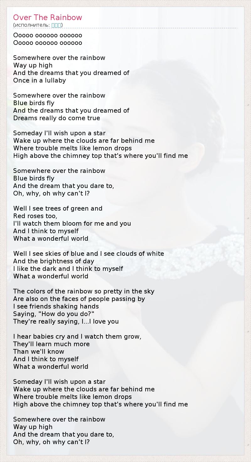 Ooooo oooooo oooooo Ooooo oooooo oooooo Где-то высоко над радугой Есть то, о чем ты мечтал, Еще в те времена, Когда слушал колыбельные. Где-то высоко над радугой Летают певчие птицы. И мечты, которыми ты грезил, Действительно сбываются. Когда-нибудь я загадаю желание под падающей звездой, И проснусь там, где увижу облака далеко внизу, Где проблемы тают, словно леденцы. Ты найдешь меня в небе высоко над крышами. Где-то высоко над радугой Летают певчие птицы. Там сбудется о чем ты только осмеливался мечтать, Когда спрашивал себя: "Ну почему, почему я не могу?..." Я вижу зеленые деревья, Цветущие розы, Я вижу, как они цветут для нас с тобой, И думаю, Как чудесен этот мир. Я вижу голубое небо и белые облака на нем, Я люблю свет дня и темноту, И я думаю, Как чудесен этот мир. Цвета радуги так красивы в небе, Они играют на лицах прохожих, Я вижу друзей, пожимающих друг другу руки, Спрашивающих: "Как дела"? Они в действительности говорят: "Я люблю тебя". Я слышу детский плач, я вижу, как малыши растут, Они узнают гораздо больше, Чем знаем мы. И я думаю, Как чудесен этот мир.* Когда-нибудь я загадаю желание под падающей звездой, И проснусь там, где увижу облака далеко внизу, Где проблемы тают, словно леденцы. Ты найдешь меня в небе высоко над крышами. Где-то высоко над радугой, В самой вышине, Сбудется о чем ты только осмеливался мечтать, Когда спрашивал себя: "Ну почему, почему я не могу?..." *Слова из песни Louis Armstrong – What a wonderful world.