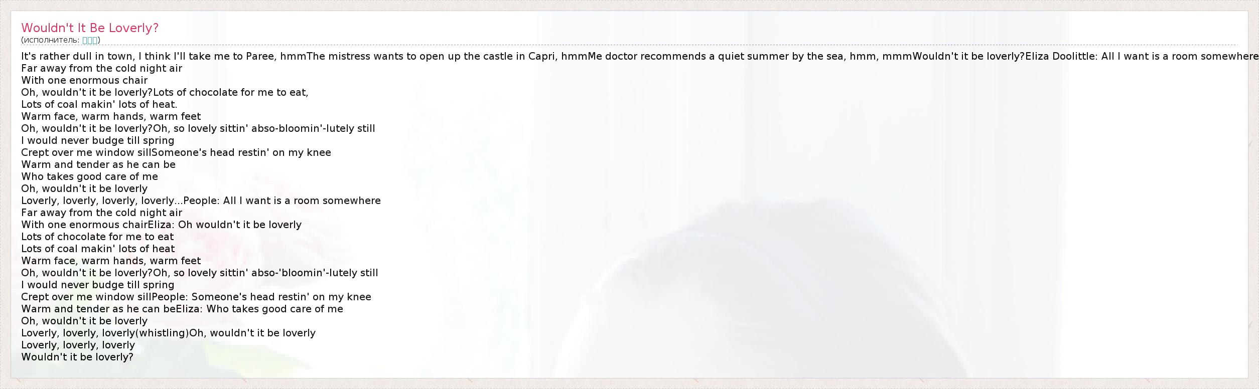 It's rather dull in town, I think I'll take me to Paree, hmmThe mistress wants to open up the castle in Capri, hmmMe doctor recommends a quiet summer by the sea, hmm, mmmWouldn't it be loverly?Eliza Doolittle: All I want is a room somewhere Far away from the cold night air With one enormous chair Oh, wouldn't it be loverly?Lots of chocolate for me to eat, Lots of coal makin' lots of heat. Warm face, warm hands, warm feet Oh, wouldn't it be loverly?Oh, so lovely sittin' abso-bloomin'-lutely still I would never budge till spring Crept over me window sillSomeone's head restin' on my knee Warm and tender as he can be Who takes good care of me Oh, wouldn't it be loverly Loverly, loverly, loverly, loverly...People: All I want is a room somewhere Far away from the cold night air With one enormous chairEliza: Oh wouldn't it be loverly Lots of chocolate for me to eat Lots of coal makin' lots of heat Warm face, warm hands, warm feet Oh, wouldn't it be loverly?Oh, so lovely sittin' abso-'bloomin'-lutely still I would never budge till spring Crept over me window sillPeople: Someone's head restin' on my knee Warm and tender as he can beEliza: Who takes good care of me Oh, wouldn't it be loverly Loverly, loverly, loverly(whistling)Oh, wouldn't it be loverly Loverly, loverly, loverly Wouldn't it be loverly?