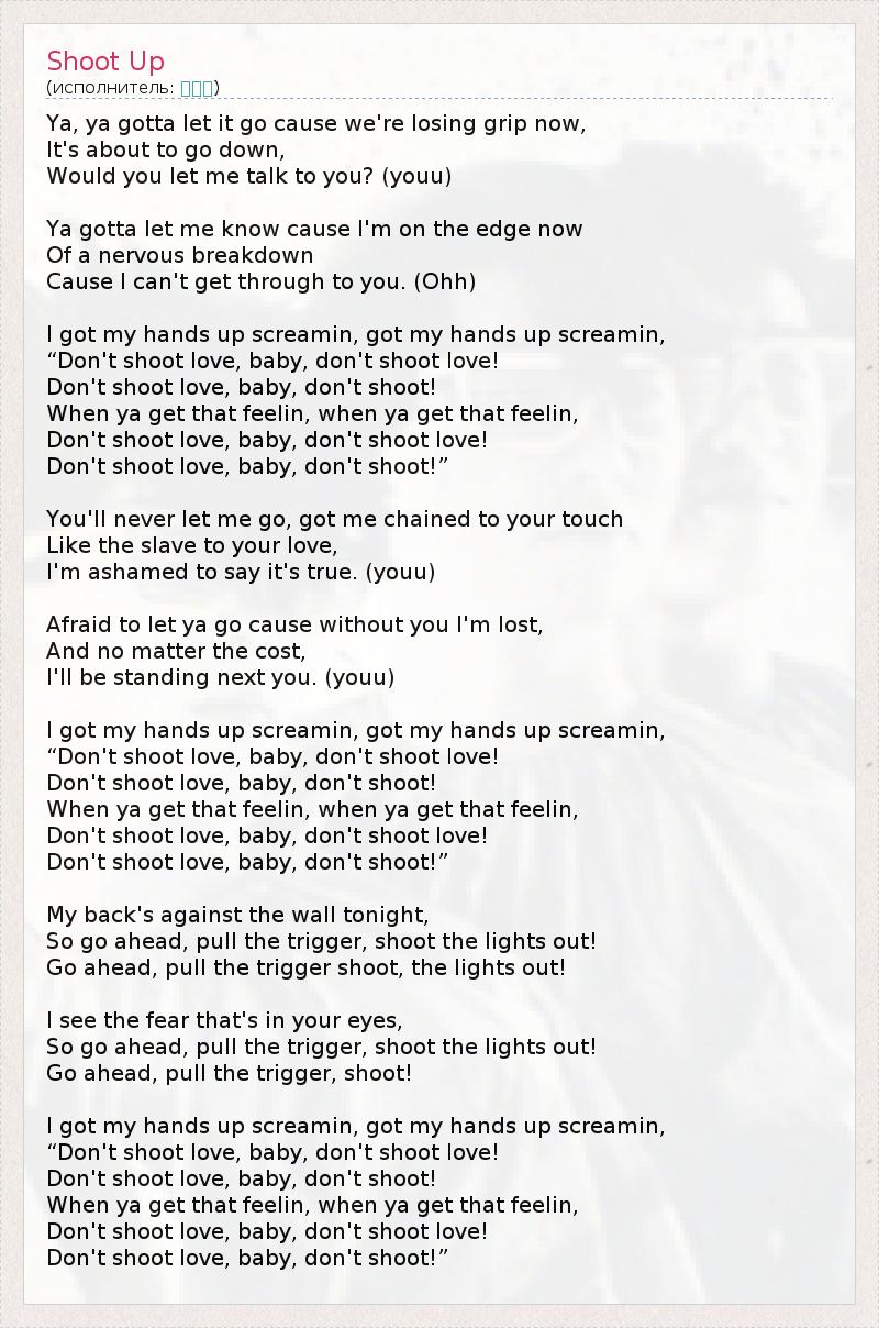 Да-да, отпусти, потому что мы теряем связь, Это вот-вот случится. Ты позволишь мне поговорить с тобой? (С тобо-о-ой?) Ты должна сказать мне, потому что я на грани Нервного срыва, Оттого что не могу пробиться к тебе. (О-о-о!) Я поднимаю руки и кричу, поднимаю руки и кричу: "Не стреляй в любовь, милая, не стреляй в любовь! Не стреляй в любовь, милая, не стреляй! Когда у тебя появится это чувство, когда у тебя появится это чувство, Не стреляй в любовь, милая, не стреляй в любовь! Не стреляй в любовь, милая, не стреляй!" Ты никогда не отпустишь меня, ты приковала меня к своим ласкам, Словно я раб твоей любви, Стыдно признаваться, что это правда. (Ты-ы-ы!) Боюсь отпустить тебя, потому что я пропаду без тебя, Цена не имеет значения, Я буду рядом с тобой. (С тобо-о-ой!) Я поднимаю руки и кричу, поднимаю руки и кричу: "Не стреляй в любовь, милая, не стреляй в любовь! Не стреляй в любовь, милая, не стреляй! Когда у тебя появится это чувство, когда у тебя появится это чувство, Не стреляй в любовь, милая, не стреляй в любовь! Не стреляй в любовь, милая, не стреляй!" Сегодня меня припёрли к стене, Давай, жми на спуск, расстреляй огни! Давай, жми на спуск, расстреляй огни! Я вижу страх в твоих глазах, Давай, жми на спуск, расстреляй огни! Давай, жми на спуск, стреляй! Я поднимаю руки и кричу, поднимаю руки и кричу: "Не стреляй в любовь, милая, не стреляй в любовь! Не стреляй в любовь, милая, не стреляй! Когда у тебя появится это чувство, когда у тебя появится это чувство, Не стреляй в любовь, милая, не стреляй в любовь! Не стреляй в любовь, милая, не стреляй!"