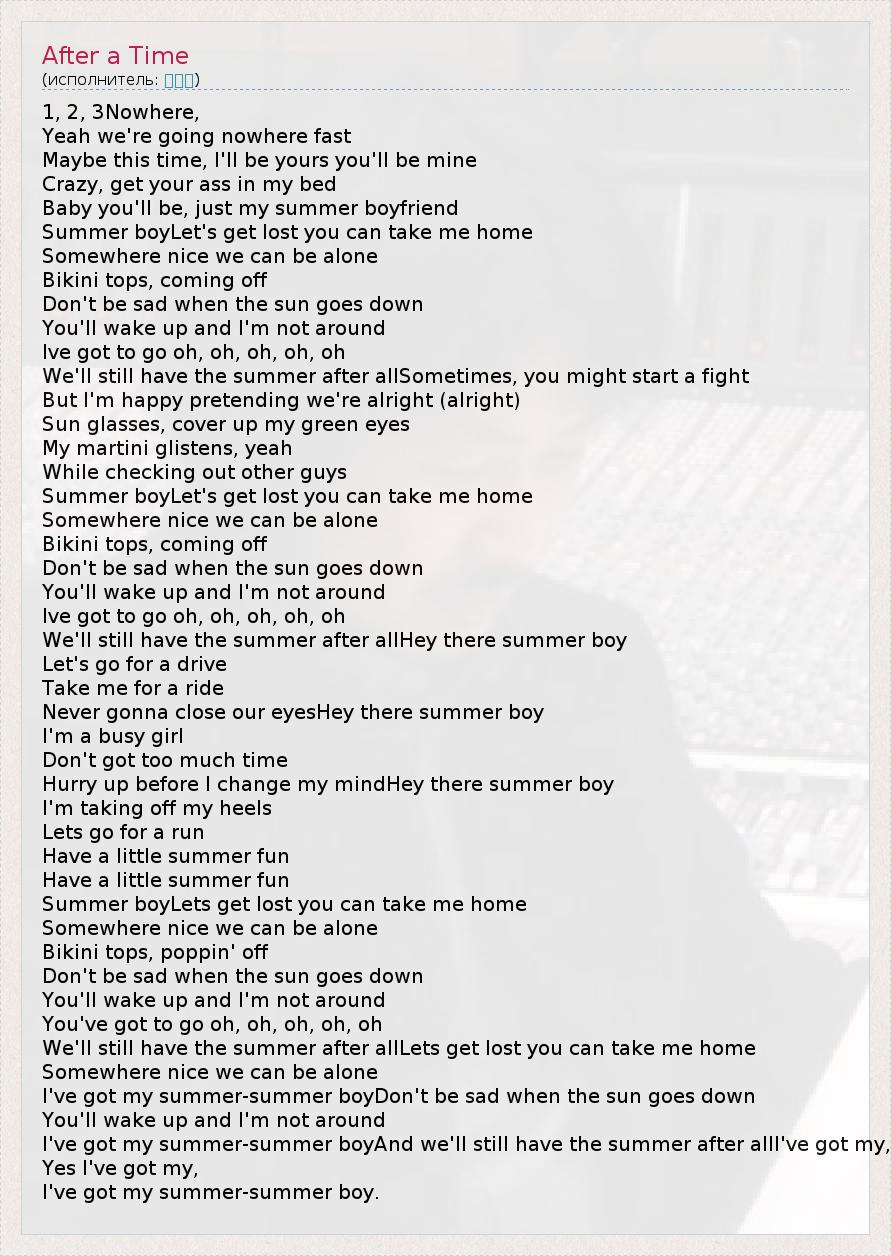 1, 2, 3Nowhere, Yeah we're going nowhere fast Maybe this time, I'll be yours you'll be mine Crazy, get your ass in my bed Baby you'll be, just my summer boyfriend Summer boyLet's get lost you can take me home Somewhere nice we can be alone Bikini tops, coming off Don't be sad when the sun goes down You'll wake up and I'm not around Ive got to go oh, oh, oh, oh, oh We'll still have the summer after allSometimes, you might start a fight But I'm happy pretending we're alright (alright) Sun glasses, cover up my green eyes My martini glistens, yeah While checking out other guys Summer boyLet's get lost you can take me home Somewhere nice we can be alone Bikini tops, coming off Don't be sad when the sun goes down You'll wake up and I'm not around Ive got to go oh, oh, oh, oh, oh We'll still have the summer after allHey there summer boy Let's go for a drive Take me for a ride Never gonna close our eyesHey there summer boy I'm a busy girl Don't got too much time Hurry up before I change my mindHey there summer boy I'm taking off my heels Lets go for a run Have a little summer fun Have a little summer fun Summer boyLets get lost you can take me home Somewhere nice we can be alone Bikini tops, poppin' off Don't be sad when the sun goes down You'll wake up and I'm not around You've got to go oh, oh, oh, oh, oh We'll still have the summer after allLets get lost you can take me home Somewhere nice we can be alone I've got my summer-summer boyDon't be sad when the sun goes down You'll wake up and I'm not around I've got my summer-summer boyAnd we'll still have the summer after allI've got my, Yes I've got my, I've got my summer-summer boy.