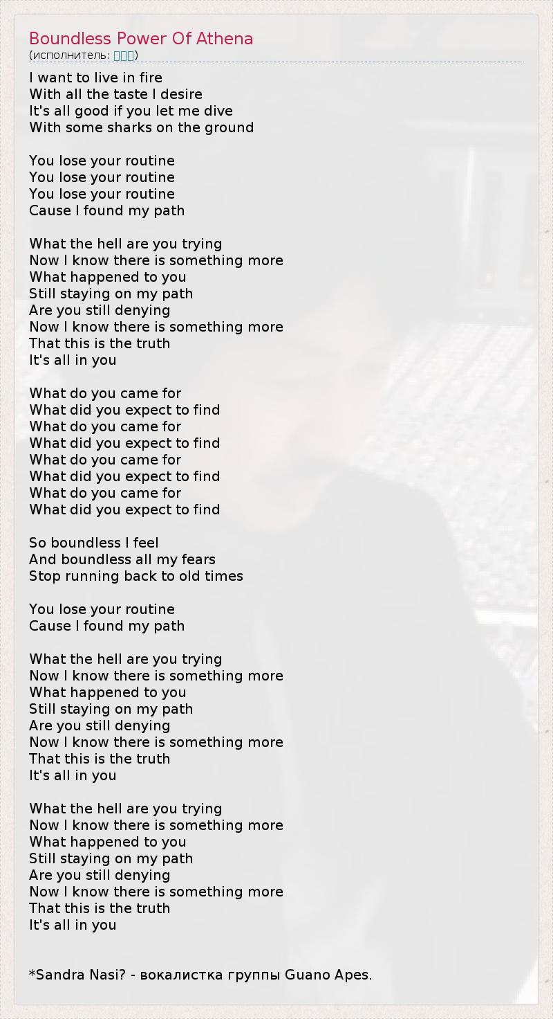 I want to live in fire With all the taste I desire It's all good if you let me dive With some sharks on the ground You lose your routine You lose your routine You lose your routine Cause I found my path What the hell are you trying Now I know there is something more What happened to you Still staying on my path Are you still denying Now I know there is something more That this is the truth It's all in you What do you came for What did you expect to find What do you came for What did you expect to find What do you came for What did you expect to find What do you came for What did you expect to find So boundless I feel And boundless all my fears Stop running back to old times You lose your routine Cause I found my path What the hell are you trying Now I know there is something more What happened to you Still staying on my path Are you still denying Now I know there is something more That this is the truth It's all in you What the hell are you trying Now I know there is something more What happened to you Still staying on my path Are you still denying Now I know there is something more That this is the truth It's all in you *Sandra Nasi? - вокалистка группы Guano Apes.