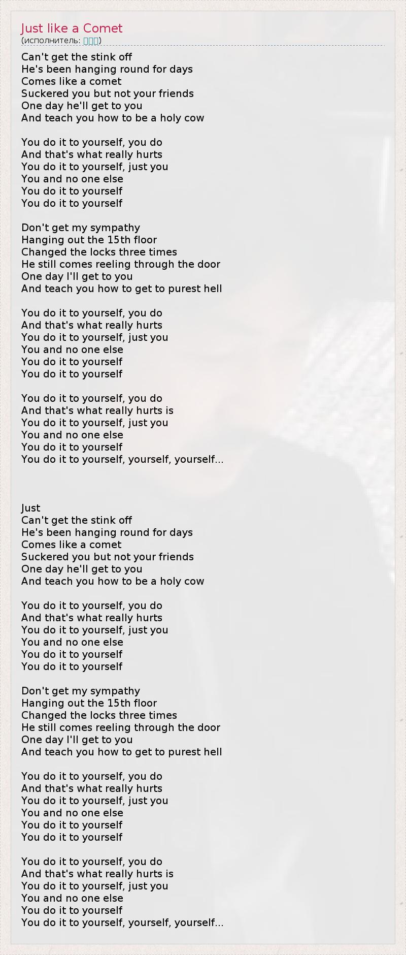 Can't get the stink off He's been hanging round for days Comes like a comet Suckered you but not your friends One day he'll get to you And teach you how to be a holy cow You do it to yourself, you do And that's what really hurts You do it to yourself, just you You and no one else You do it to yourself You do it to yourself Don't get my sympathy Hanging out the 15th floor Changed the locks three times He still comes reeling through the door One day I'll get to you And teach you how to get to purest hell You do it to yourself, you do And that's what really hurts You do it to yourself, just you You and no one else You do it to yourself You do it to yourself You do it to yourself, you do And that's what really hurts is You do it to yourself, just you You and no one else You do it to yourself You do it to yourself, yourself, yourself... Just Can't get the stink off He's been hanging round for days Comes like a comet Suckered you but not your friends One day he'll get to you And teach you how to be a holy cow You do it to yourself, you do And that's what really hurts You do it to yourself, just you You and no one else You do it to yourself You do it to yourself Don't get my sympathy Hanging out the 15th floor Changed the locks three times He still comes reeling through the door One day I'll get to you And teach you how to get to purest hell You do it to yourself, you do And that's what really hurts You do it to yourself, just you You and no one else You do it to yourself You do it to yourself You do it to yourself, you do And that's what really hurts is You do it to yourself, just you You and no one else You do it to yourself You do it to yourself, yourself, yourself...