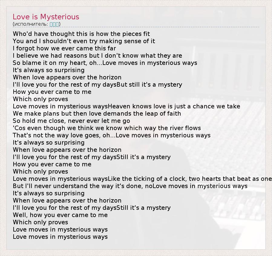 Who'd have thought this is how the pieces fit You and I shouldn't even try making sense of it I forgot how we ever came this far I believe we had reasons but I don't know what they are So blame it on my heart, oh...Love moves in mysterious ways It's always so surprising When love appears over the horizon I'll love you for the rest of my daysBut still it's a mystery How you ever came to me Which only proves Love moves in mysterious waysHeaven knows love is just a chance we take We make plans but then love demands the leap of faith So hold me close, never ever let me go 'Cos even though we think we know which way the river flows That's not the way love goes, oh...Love moves in mysterious ways It's always so surprising When love appears over the horizon I'll love you for the rest of my daysStill it's a mystery How you ever came to me Which only proves Love moves in mysterious waysLike the ticking of a clock, two hearts that beat as one But I'll never understand the way it's done, noLove moves in mysterious ways It's always so surprising When love appears over the horizon I'll love you for the rest of my daysStill it's a mystery Well, how you ever came to me Which only proves Love moves in mysterious ways Love moves in mysterious ways
