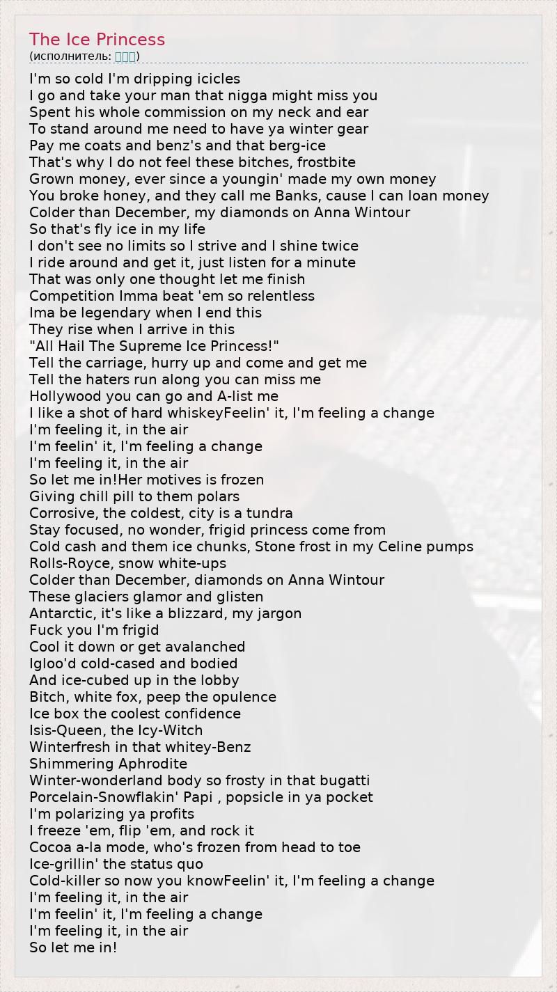 I'm so cold I'm dripping icicles I go and take your man that nigga might miss you Spent his whole commission on my neck and ear To stand around me need to have ya winter gear Pay me coats and benz's and that berg-ice That's why I do not feel these bitches, frostbite Grown money, ever since a youngin' made my own money You broke honey, and they call me Banks, cause I can loan money Colder than December, my diamonds on Anna Wintour So that's fly ice in my life I don't see no limits so I strive and I shine twice I ride around and get it, just listen for a minute That was only one thought let me finish Competition Imma beat 'em so relentless Ima be legendary when I end this They rise when I arrive in this "All Hail The Supreme Ice Princess!" Tell the carriage, hurry up and come and get me Tell the haters run along you can miss me Hollywood you can go and A-list me I like a shot of hard whiskeyFeelin' it, I'm feeling a change I'm feeling it, in the air I'm feelin' it, I'm feeling a change I'm feeling it, in the air So let me in!Her motives is frozen Giving chill pill to them polars Corrosive, the coldest, city is a tundra Stay focused, no wonder, frigid princess come from Cold cash and them ice chunks, Stone frost in my Celine pumps Rolls-Royce, snow white-ups Colder than December, diamonds on Anna Wintour These glaciers glamor and glisten Antarctic, it's like a blizzard, my jargon Fuck you I'm frigid Cool it down or get avalanched Igloo'd cold-cased and bodied And ice-cubed up in the lobby Bitch, white fox, peep the opulence Ice box the coolest confidence Isis-Queen, the Icy-Witch Winterfresh in that whitey-Benz Shimmering Aphrodite Winter-wonderland body so frosty in that bugatti Porcelain-Snowflakin' Papi , popsicle in ya pocket I'm polarizing ya profits I freeze 'em, flip 'em, and rock it Cocoa a-la mode, who's frozen from head to toe Ice-grillin' the status quo Cold-killer so now you knowFeelin' it, I'm feeling a change I'm feeling it, in the air I'm feelin' it, I'm feeling a change I'm feeling it, in the air So let me in!