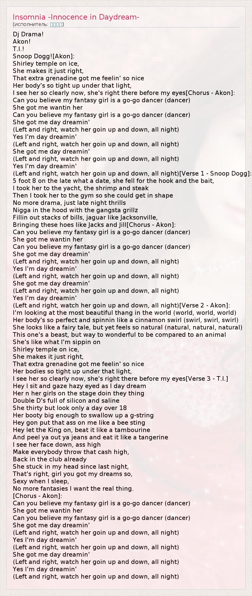 Dj Drama! Akon! T.I.! Snoop Dogg![Akon]: Shirley temple on ice, She makes it just right, That extra grenadine got me feelin' so nice Her body's so tight up under that light, I see her so clearly now, she's right there before my eyes[Chorus - Akon]: Can you believe my fantasy girl is a go-go dancer (dancer) She got me wantin her Can you believe my fantasy girl is a go-go dancer (dancer) She got me day dreamin' (Left and right, watch her goin up and down, all night) Yes I'm day dreamin' (Left and right, watch her goin up and down, all night) She got me day dreamin' (Left and right, watch her goin up and down, all night) Yes I'm day dreamin' (Left and right, watch her goin up and down, all night)[Verse 1 - Snoop Dogg]: 5 foot 8 on the late what a date, she fell for the hook and the bait, I took her to the yacht, the shrimp and steak Then I took her to the gym so she could get in shape No more drama, just late night thrills Nigga in the hood with the gangsta grillz Fillin out stacks of bills, jaguar like Jacksonville, Bringing these hoes like Jacks and Jill[Chorus - Akon]: Can you believe my fantasy girl is a go-go dancer (dancer) She got me wantin her Can you believe my fantasy girl is a go-go dancer (dancer) She got me day dreamin' (Left and right, watch her goin up and down, all night) Yes I'm day dreamin' (Left and right, watch her goin up and down, all night) She got me day dreamin' (Left and right, watch her goin up and down, all night) Yes I'm day dreamin' (Left and right, watch her goin up and down, all night)[Verse 2 - Akon]: I'm looking at the most beautiful thang in the world (world, world, world) Her body's so perfect and spinnin like a cinnamon swirl (swirl, swirl, swirl) She looks like a fairy tale, but yet feels so natural (natural, natural, natural) This one's a beast, but way to wonderful to be compared to an animal She's like what I'm sippin on Shirley temple on ice, She makes it just right, That extra grenadine got me feelin' so nice Her bodies so tight up under that light, I see her so clearly now, she's right there before my eyes[Verse 3 - T.I.] Hey I sit and gaze hazy eyed as I day dream Her n her girls on the stage doin they thing Double D's full of silicon and saline She thirty but look only a day over 18 Her booty big enough to swallow up a g-string Hey gon put that ass on me like a bee sting Hey let the King on, beat it like a tambourine And peel ya out ya jeans and eat it like a tangerine I see her face down, ass high Make everybody throw that cash high, Back in the club already She stuck in my head since last night, That's right, girl you got my dreams so, Sexy when I sleep, No more fantasies I want the real thing. [Chorus - Akon]: Can you believe my fantasy girl is a go-go dancer (dancer) She got me wantin her Can you believe my fantasy girl is a go-go dancer (dancer) She got me day dreamin' (Left and right, watch her goin up and down, all night) Yes I'm day dreamin' (Left and right, watch her goin up and down, all night) She got me day dreamin' (Left and right, watch her goin up and down, all night) Yes I'm day dreamin' (Left and right, watch her goin up and down, all night)
