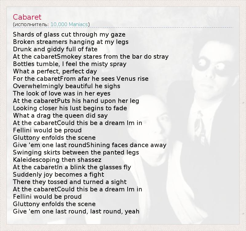 Shards of glass cut through my gaze Broken streamers hanging at my legs Drunk and giddy full of fate At the cabaretSmokey stares from the bar do stray Bottles tumble, I feel the misty spray What a perfect, perfect day For the cabaretFrom afar he sees Venus rise Overwhelmingly beautiful he sighs The look of love was in her eyes At the cabaretPuts his hand upon her leg Looking closer his lust begins to fade What a drag the queen did say At the cabaretCould this be a dream Im in Fellini would be proud Gluttony enfolds the scene Give 'em one last roundShining faces dance away Swinging skirts between the panted legs Kaleidescoping then shassez At the cabaretIn a blink the glasses fly Suddenly joy becomes a fight There they tossed and turned a sight At the cabaretCould this be a dream Im in Fellini would be proud Gluttony enfolds the scene Give 'em one last round, last round, yeah