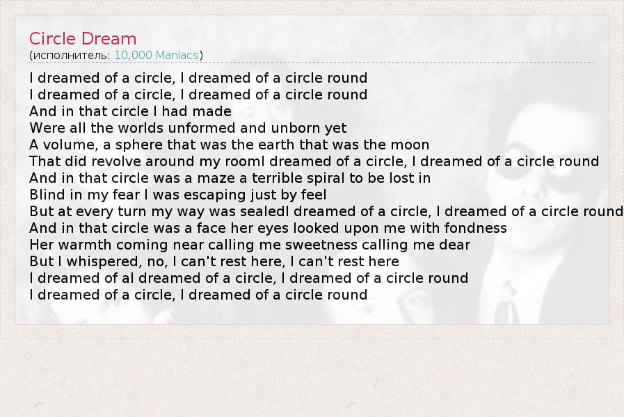 I dreamed of a circle, I dreamed of a circle round I dreamed of a circle, I dreamed of a circle round And in that circle I had made Were all the worlds unformed and unborn yet A volume, a sphere that was the earth that was the moon That did revolve around my roomI dreamed of a circle, I dreamed of a circle round And in that circle was a maze a terrible spiral to be lost in Blind in my fear I was escaping just by feel But at every turn my way was sealedI dreamed of a circle, I dreamed of a circle round And in that circle was a face her eyes looked upon me with fondness Her warmth coming near calling me sweetness calling me dear But I whispered, no, I can't rest here, I can't rest here I dreamed of aI dreamed of a circle, I dreamed of a circle round I dreamed of a circle, I dreamed of a circle round