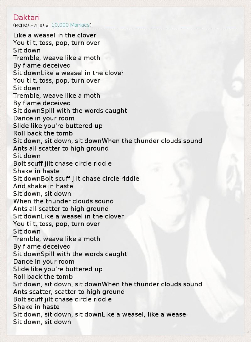 Like a weasel in the clover You tilt, toss, pop, turn over Sit down Tremble, weave like a moth By flame deceived Sit downLike a weasel in the clover You tilt, toss, pop, turn over Sit down Tremble, weave like a moth By flame deceived Sit downSpill with the words caught Dance in your room Slide like you're buttered up Roll back the tomb Sit down, sit down, sit downWhen the thunder clouds sound Ants all scatter to high ground Sit down Bolt scuff jilt chase circle riddle Shake in haste Sit downBolt scuff jilt chase circle riddle And shake in haste Sit down, sit down When the thunder clouds sound Ants all scatter to high ground Sit downLike a weasel in the clover You tilt, toss, pop, turn over Sit down Tremble, weave like a moth By flame deceived Sit downSpill with the words caught Dance in your room Slide like you're buttered up Roll back the tomb Sit down, sit down, sit downWhen the thunder clouds sound Ants scatter, scatter to high ground Bolt scuff jilt chase circle riddle Shake in haste Sit down, sit down, sit downLike a weasel, like a weasel Sit down, sit down