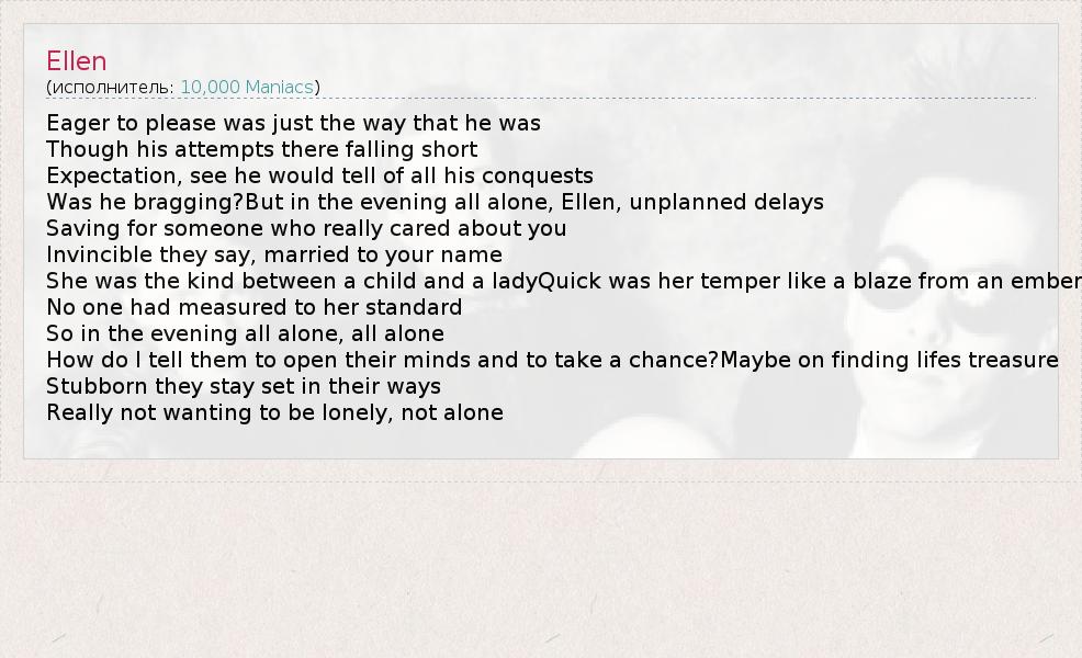 Это интересно:10,000 Мэниакс (10,000 Maniacs) - американская группа 1980-х годов. Впервые появилась в городе Джеймстаун (штат Нью-Йорк) в 1981 в составе: Натали Мерчент (вокал), Джером Огастиньяк (барабаны), Роберт Бак (гитара), Деннис Дрю (клавишные) и Стивен Густафсон (бас). Музыканты играли кавер-версии песен таких групп, как JOY DIVISION и GANG OF FOUR. В сентябре 1993 Натали Мерчент начала свою сольную карьеру.Дискография:HOPE... продолжение