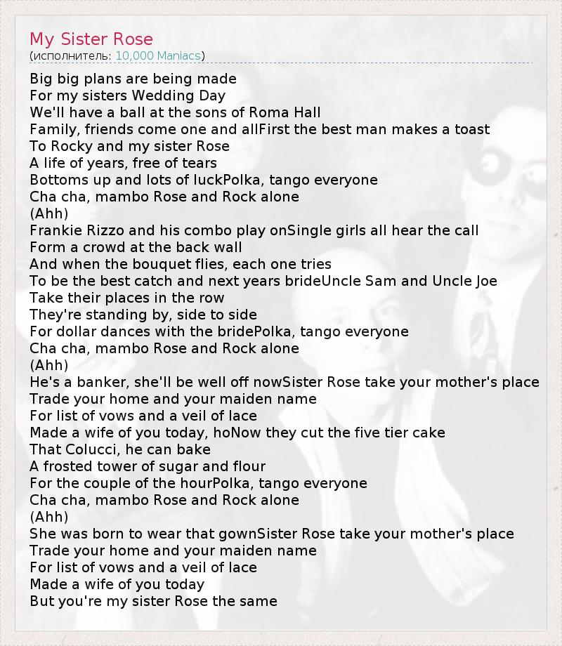 Big big plans are being made For my sisters Wedding Day We'll have a ball at the sons of Roma Hall Family, friends come one and allFirst the best man makes a toast To Rocky and my sister Rose A life of years, free of tears Bottoms up and lots of luckPolka, tango everyone Cha cha, mambo Rose and Rock alone (Ahh) Frankie Rizzo and his combo play onSingle girls all hear the call Form a crowd at the back wall And when the bouquet flies, each one tries To be the best catch and next years brideUncle Sam and Uncle Joe Take their places in the row They're standing by, side to side For dollar dances with the bridePolka, tango everyone Cha cha, mambo Rose and Rock alone (Ahh) He's a banker, she'll be well off nowSister Rose take your mother's place Trade your home and your maiden name For list of vows and a veil of lace Made a wife of you today, hoNow they cut the five tier cake That Colucci, he can bake A frosted tower of sugar and flour For the couple of the hourPolka, tango everyone Cha cha, mambo Rose and Rock alone (Ahh) She was born to wear that gownSister Rose take your mother's place Trade your home and your maiden name For list of vows and a veil of lace Made a wife of you today But you're my sister Rose the same