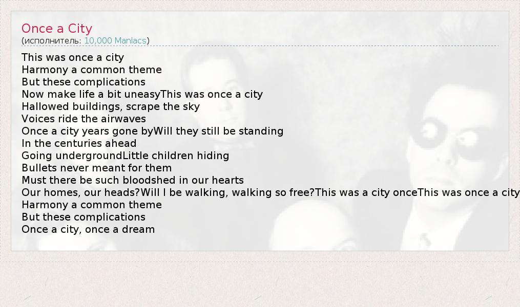 Это интересно:10,000 Мэниакс (10,000 Maniacs) - американская группа 1980-х годов. Впервые появилась в городе Джеймстаун (штат Нью-Йорк) в 1981 в составе: Натали Мерчент (вокал), Джером Огастиньяк (барабаны), Роберт Бак (гитара), Деннис Дрю (клавишные) и Стивен Густафсон (бас). Музыканты играли кавер-версии песен таких групп, как JOY DIVISION и GANG OF FOUR. В сентябре 1993 Натали Мерчент начала свою сольную карьеру.Дискография:HOPE... продолжение