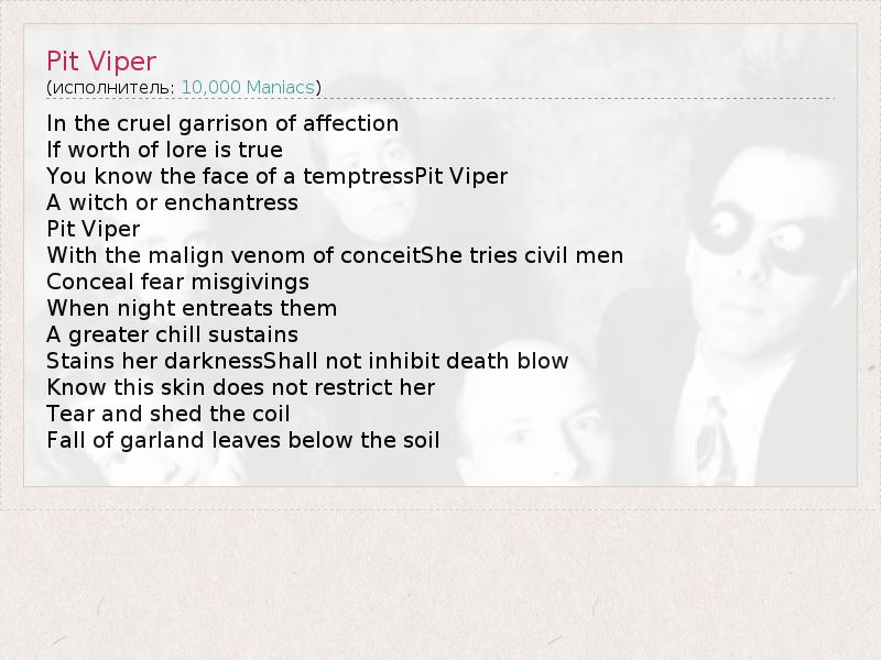 In the cruel garrison of affection If worth of lore is true You know the face of a temptressPit Viper A witch or enchantress Pit Viper With the malign venom of conceitShe tries civil men Conceal fear misgivings When night entreats them A greater chill sustains Stains her darknessShall not inhibit death blow Know this skin does not restrict her Tear and shed the coil Fall of garland leaves below the soil