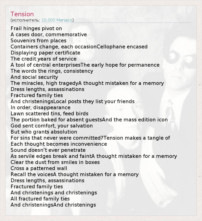Это интересно:10,000 Мэниакс (10,000 Maniacs) - американская группа 1980-х годов. Впервые появилась в городе Джеймстаун (штат Нью-Йорк) в 1981 в составе: Натали Мерчент (вокал), Джером Огастиньяк (барабаны), Роберт Бак (гитара), Деннис Дрю (клавишные) и Стивен Густафсон (бас). Музыканты играли кавер-версии песен таких групп, как JOY DIVISION и GANG OF FOUR. В сентябре 1993 Натали Мерчент начала свою сольную карьеру.Дискография:HOPE... продолжение
