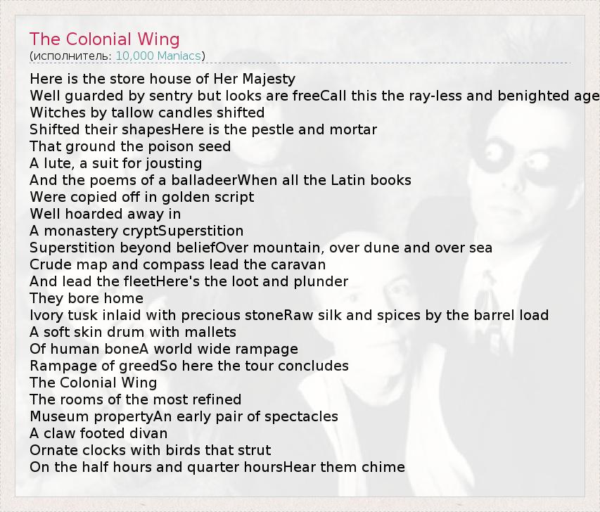 А как ты думаешь, о чем песня "The Colonial Wing" ?